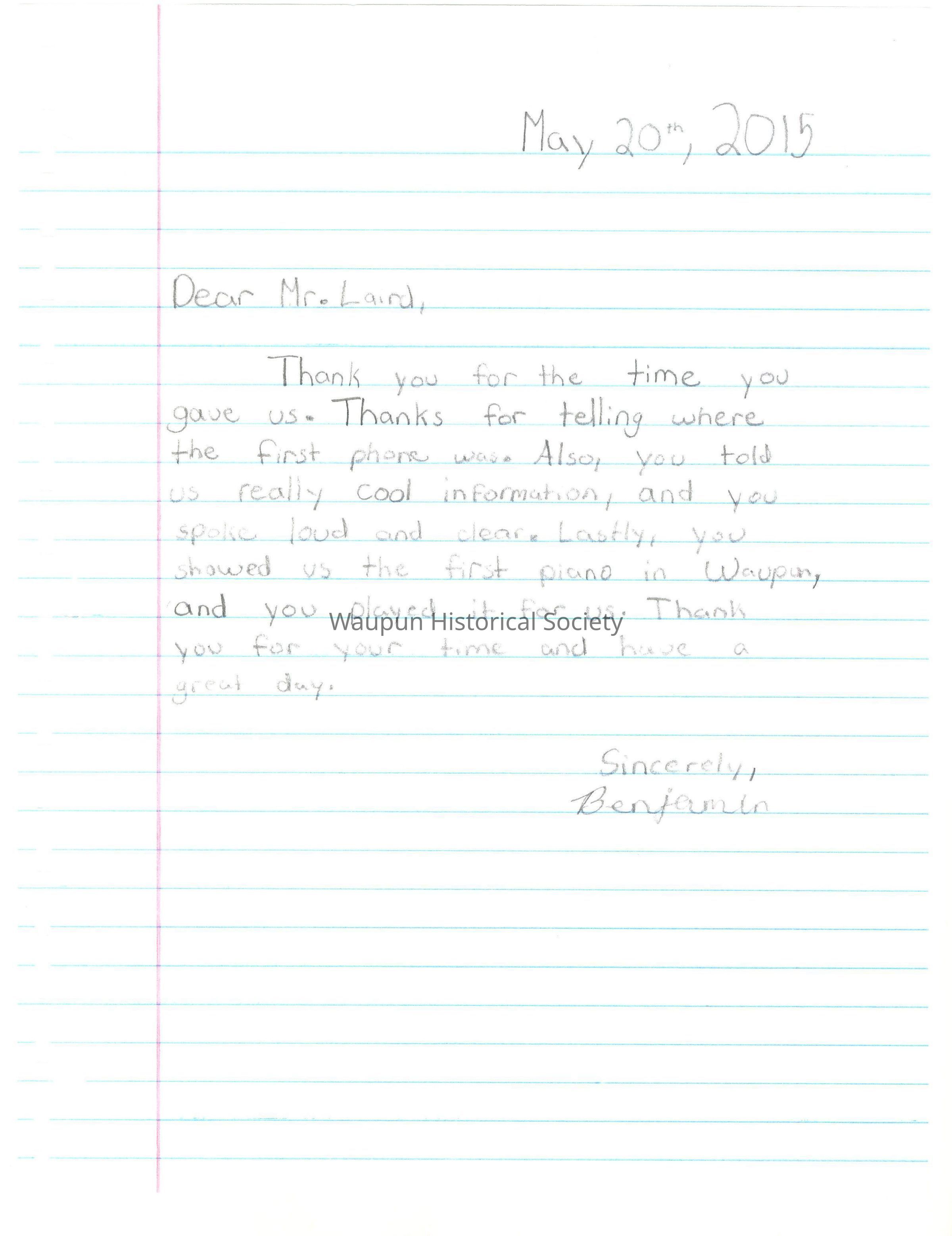 Thank you for the time you gave us. Thanks for telling where the first phone was. Also, you told us really cool information, and you spoke loud and clear. Lastly, you showed us the first piano in Waupun, and you played it for us. Thank you for your time and have a great day.