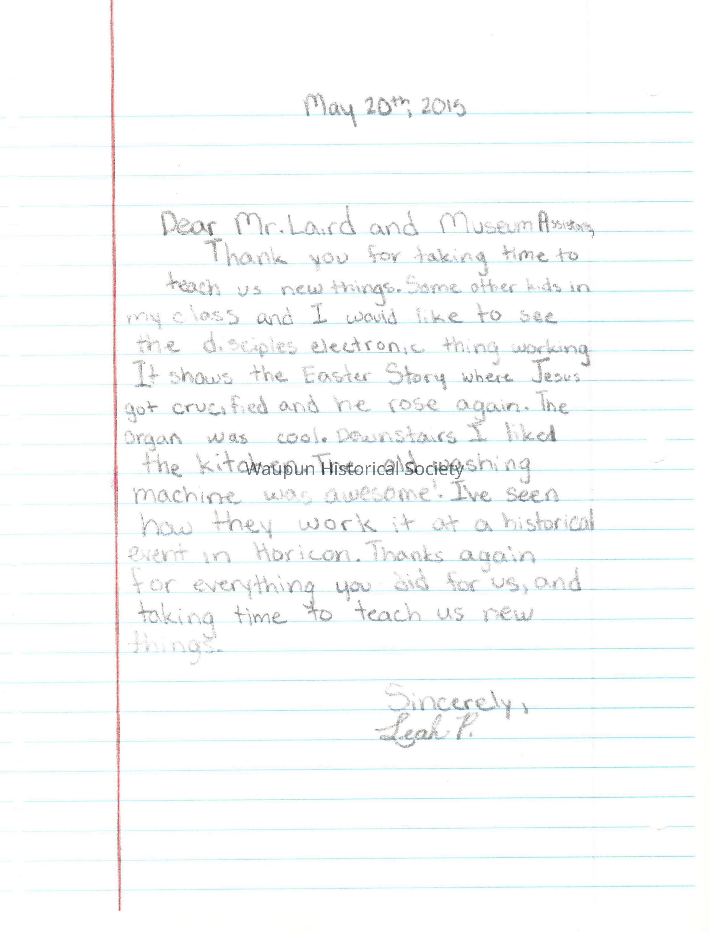 Thank you for taking time to teach us new things. Some other kids in my class and I would like to see the disciples electronic thing working. It shows the Easter Story where Jesus got crucified and he rose again. The organ was cool. Downstairs I liked the kitchen. The old washing machine was awesome! I've seen how they work it at a historical event in Horicon. Thanks again for everything you did for us, and taking time to teach us new things.