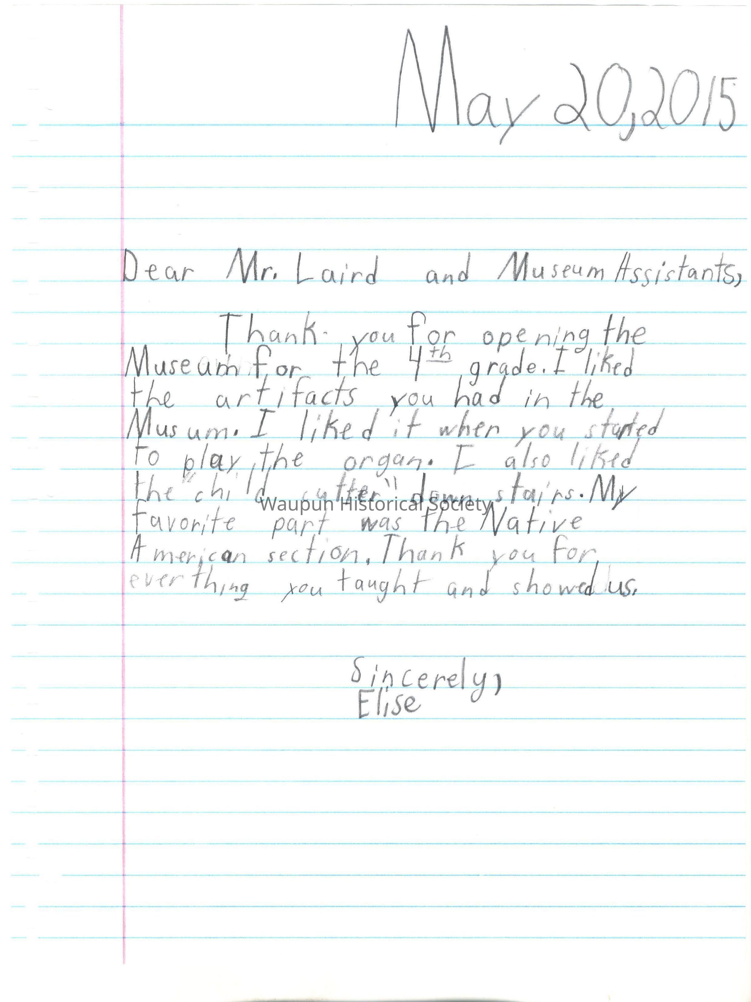 Thank you for opening the Museum and for the 4th grade. I liked the artifacts you had in the Museum. I like it when you started to play the organ. I also liked the "child cutter" down stairs. My favorite part was the Native American section. Thank you for everything ;you taught and showed us.