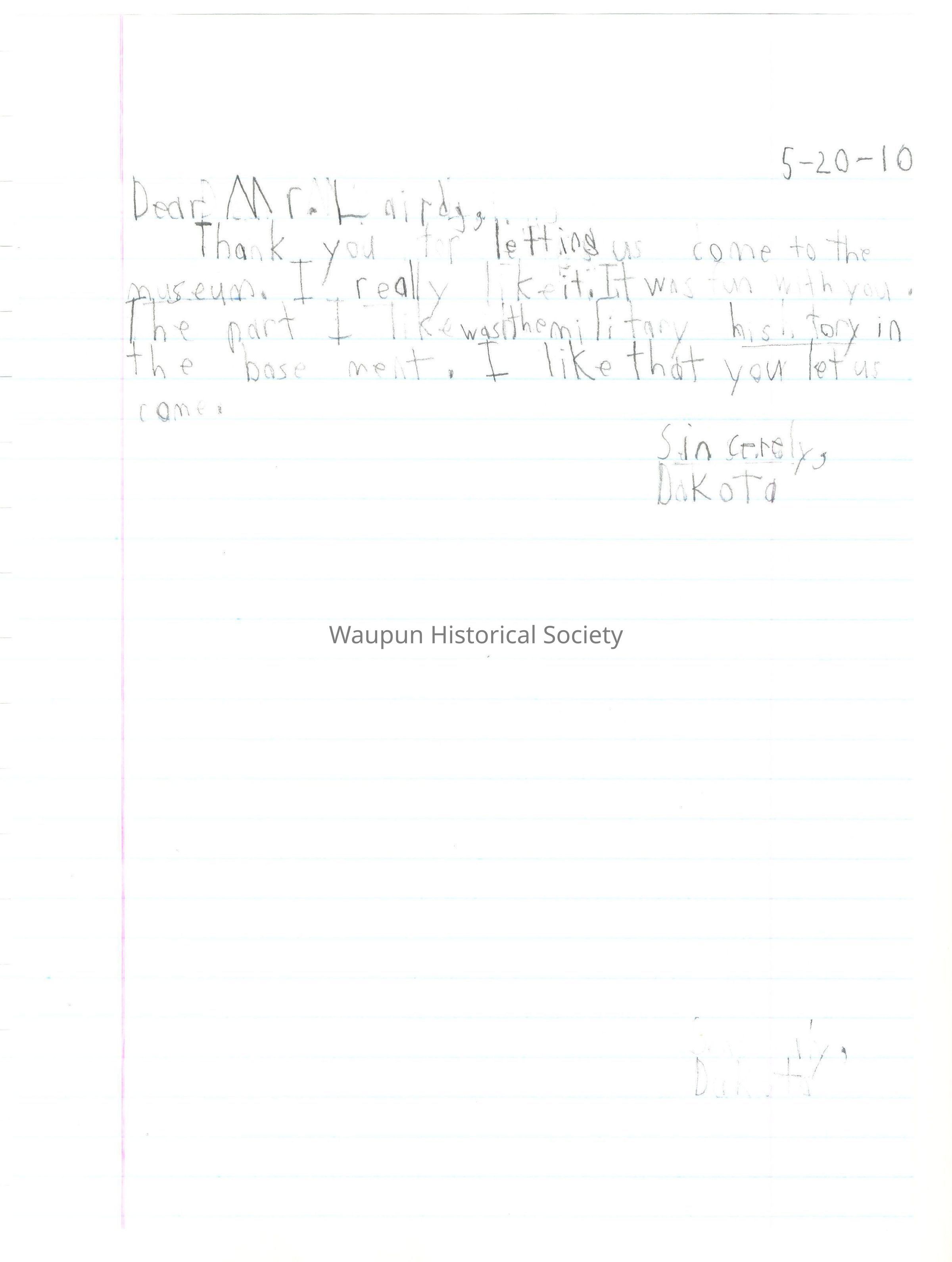 Thank you for letting us come to the museum. I really liked it. It was fun with you. The part I like was the military history in the basement. I like that you let us come.