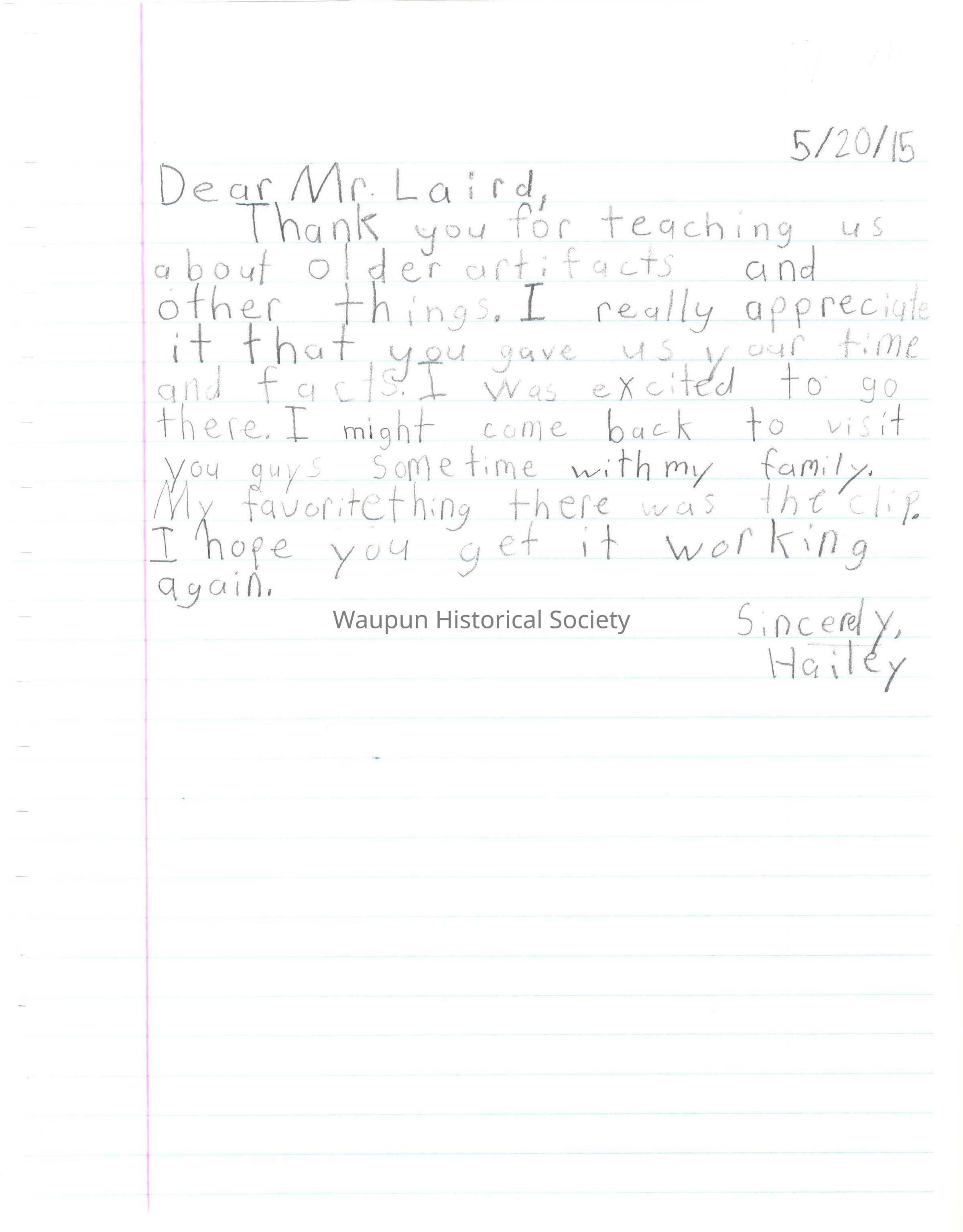 Thank you for teaching us about older artifacts and other things. I really appreciate it that you gave us your time and facts. I was excited to go there. I might come back to visit you guys sometime with my family. My favorite thing there was the clip. I hope you get it working again.