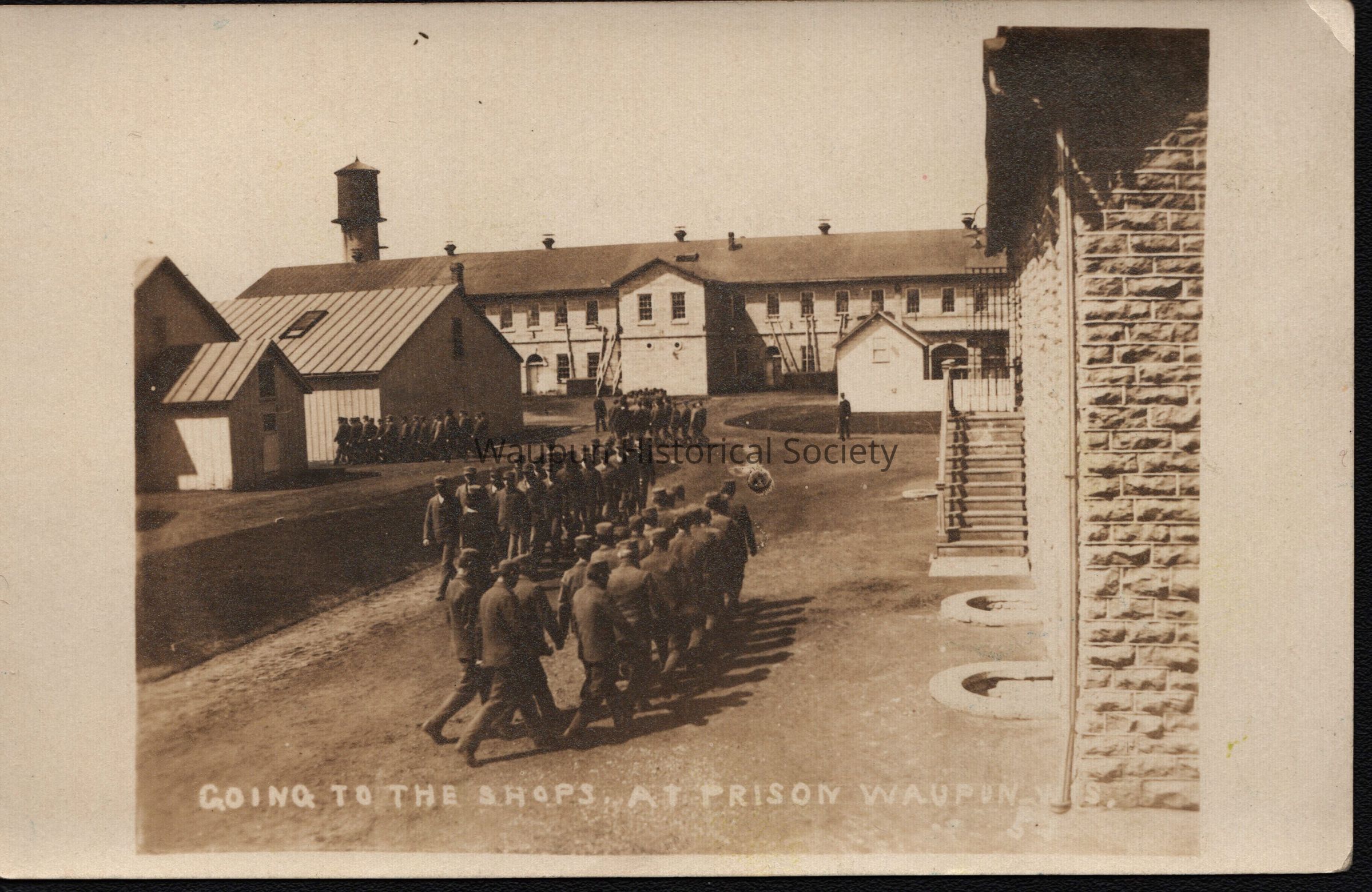 Postcard, Corrections, Wisconsin State Prison, Going to the Shops. A collection of souvenir postcards, circa 1910 featuring the Waupun State Prison. Unless otherwise noted, these postcards were taken by Stanley Johnson a local photographer at the time.