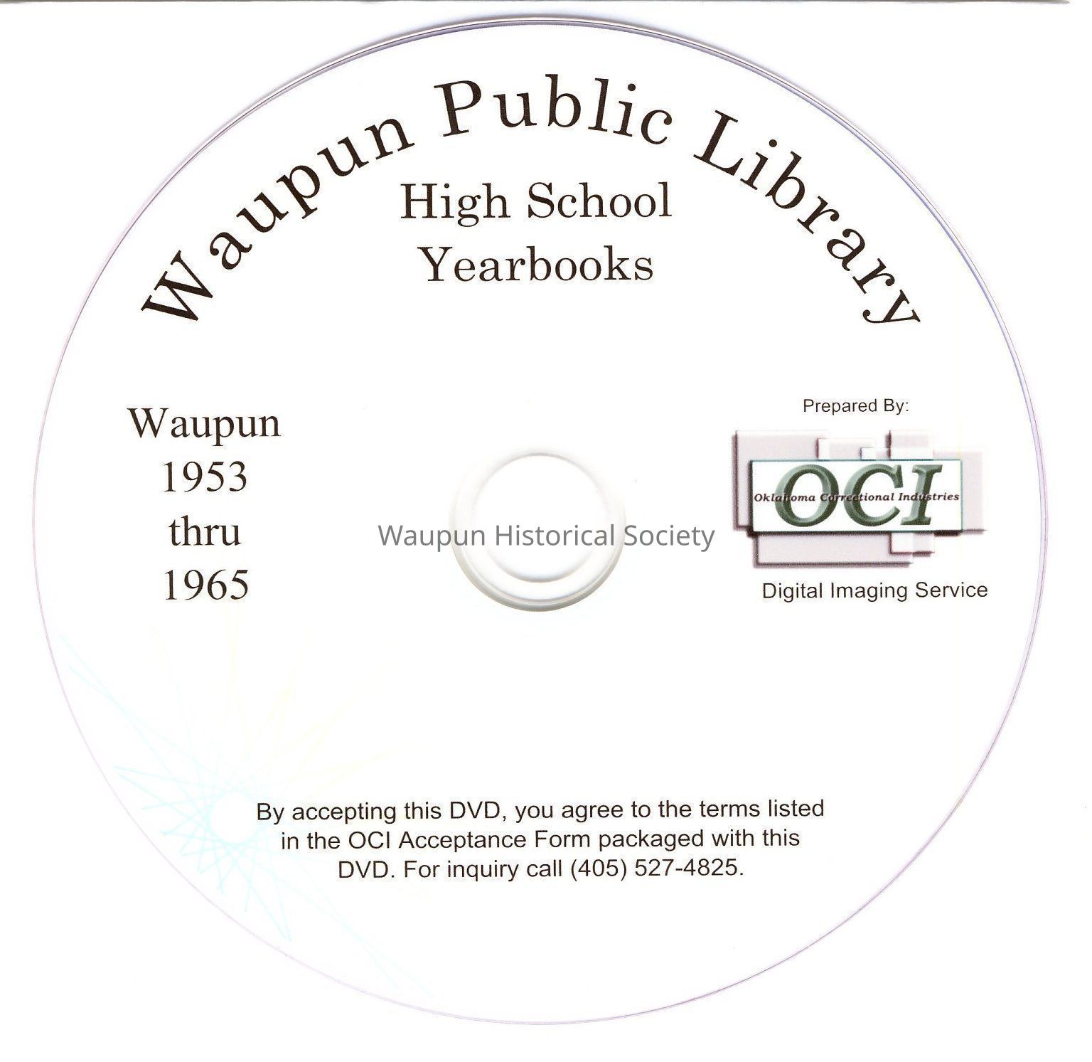 Digital Video Disc of the Waupun High School Yearbooks, 1953 thru 1965 made by Pam Garcia at the Waupun Public Library and donated to the Waupun Historical Museum.Acquisition