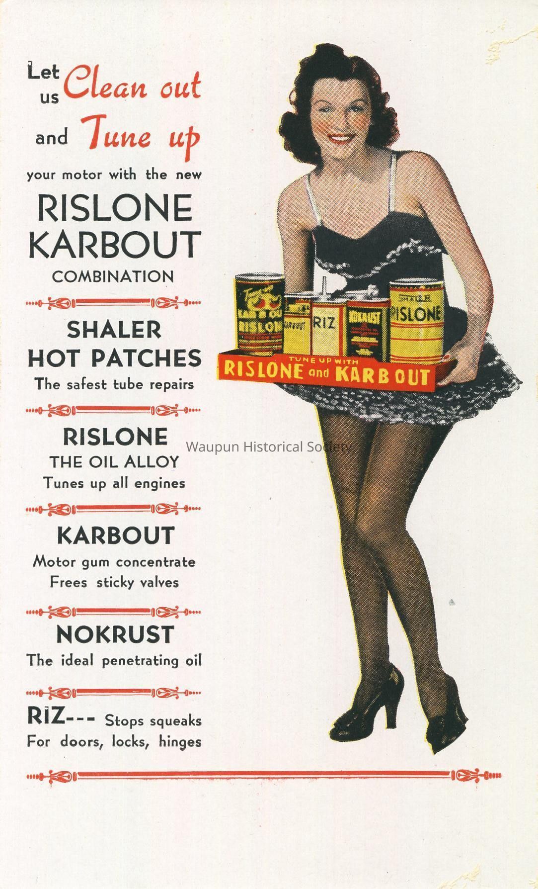 Shaler, Rislone advertising card. Shaler Hot Patches, Rislone, the Oil Alloy, Karbout, Kokrust, RIZ.