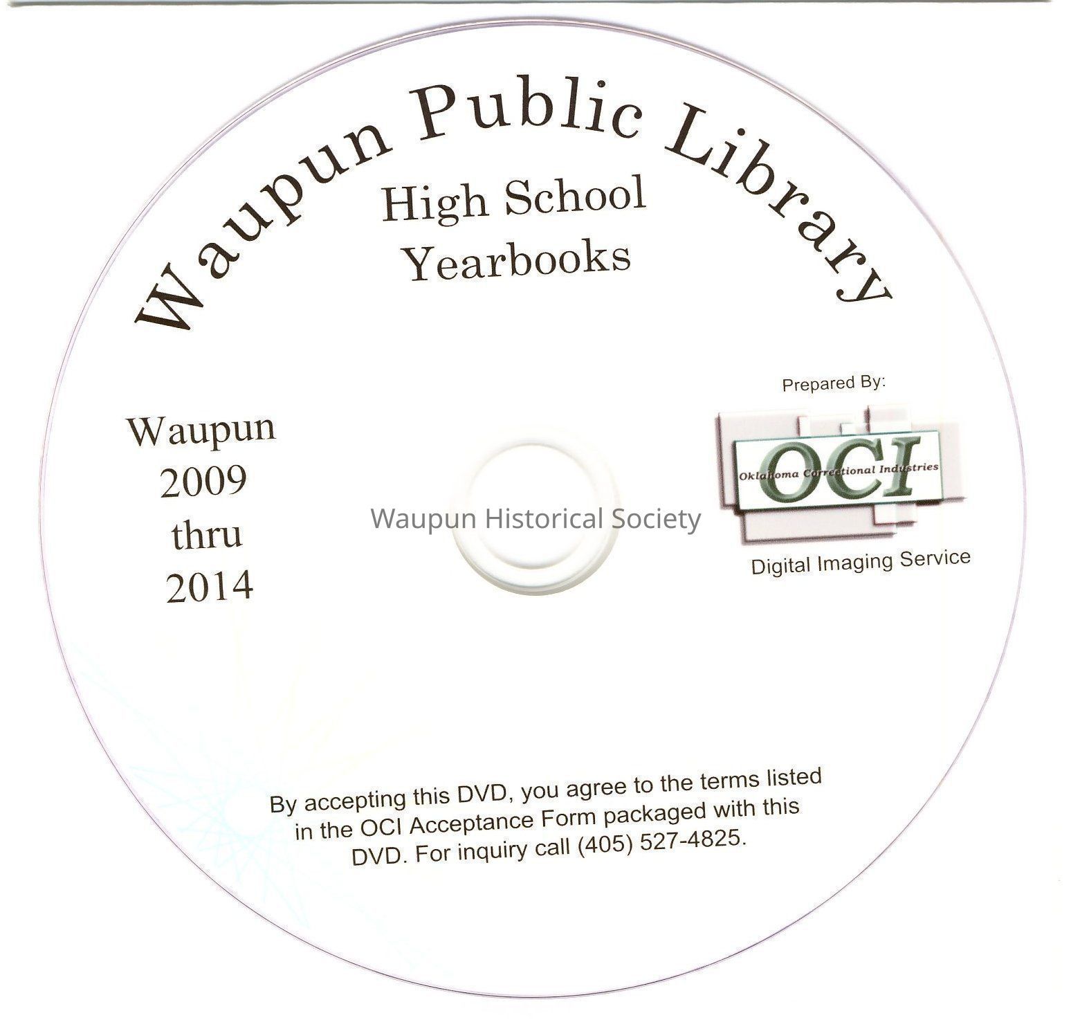 Digital Video Disc of the Waupun High School Yearbooks, 2009 thru 2014 made by Pam Garcia at the Waupun Public Library and donated to the Waupun Historical Museum.Acquisition