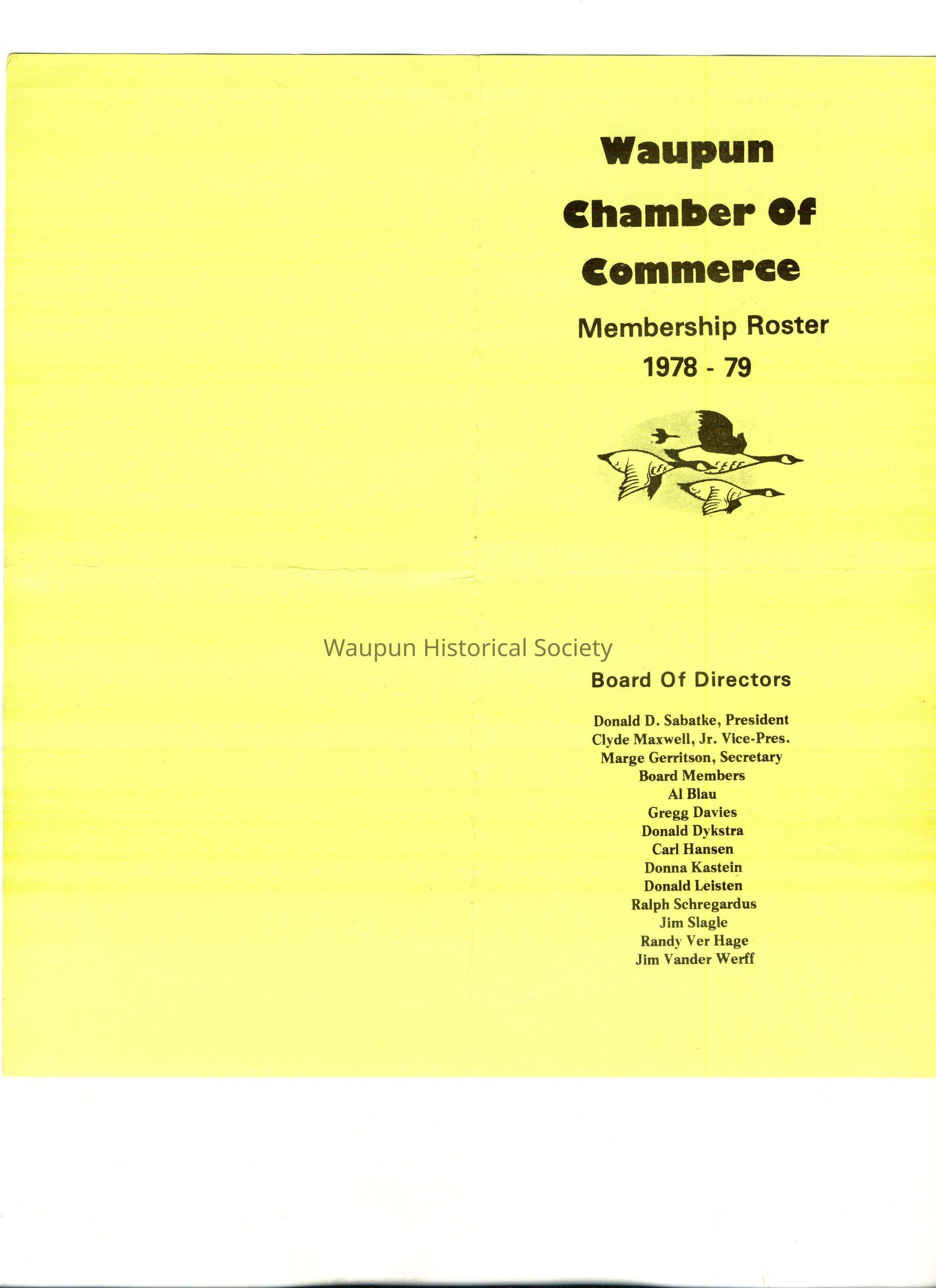 Waupun Champer of Commerce Membership Roster of 1978-79. It is in pamplet format and is yellowish green in color with black type and a picture on front page of geese flying.