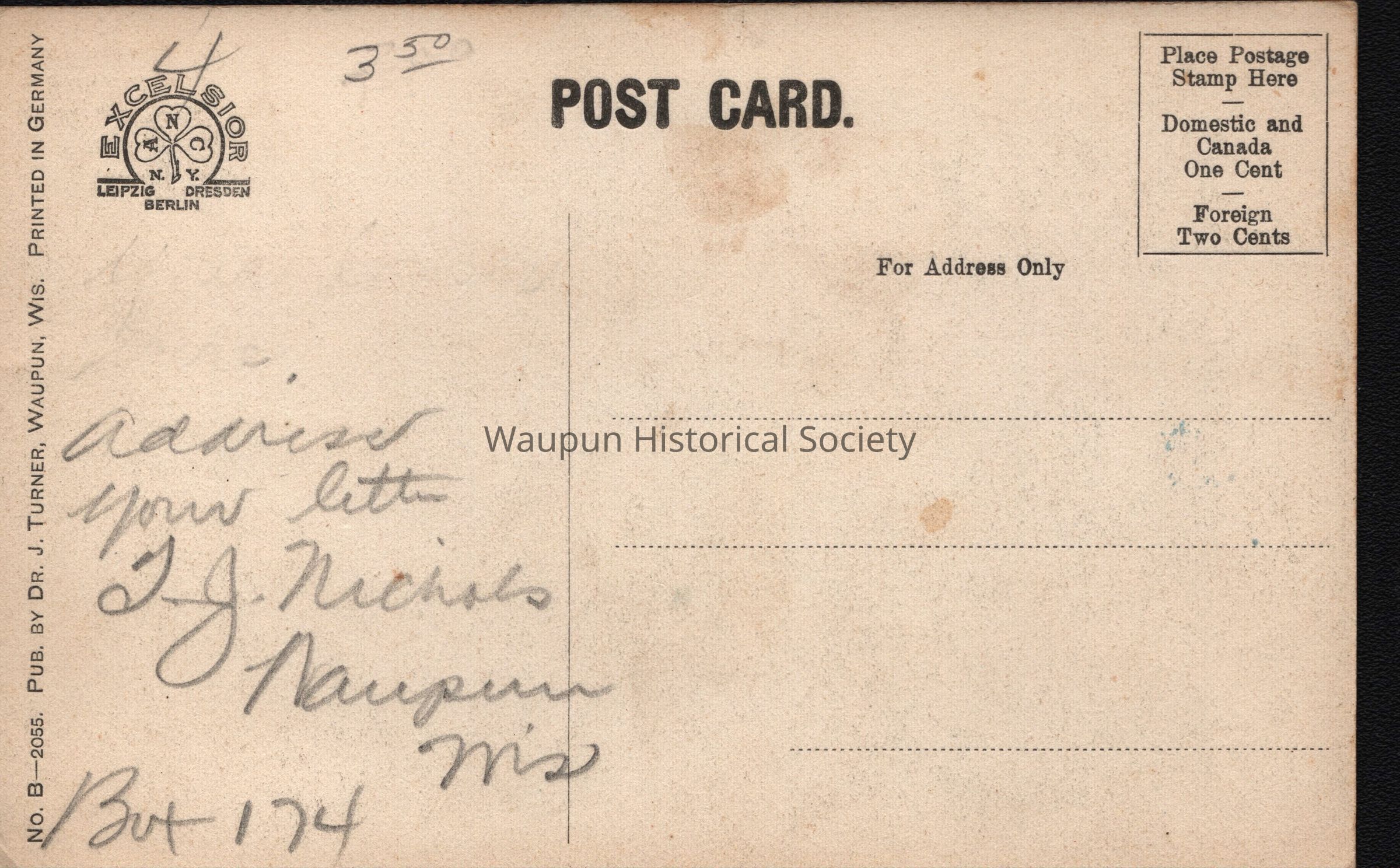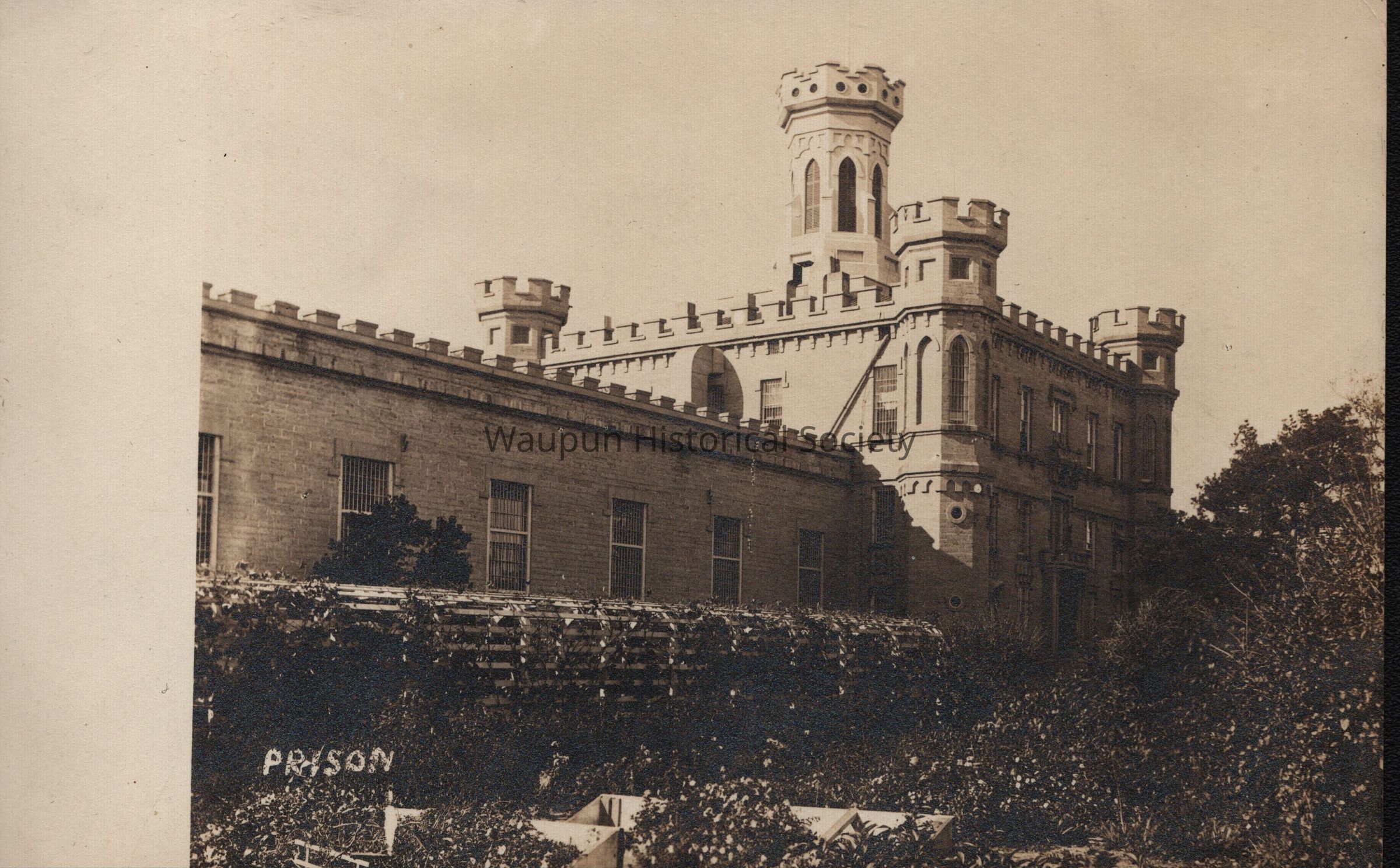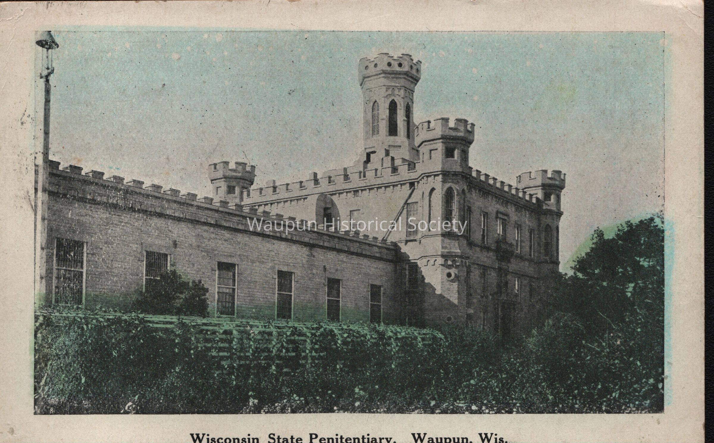 On the front of the postcard printed in red, it says; "Front Yard, Wisconsin State Prison, Waupun, Wis."Acquisition