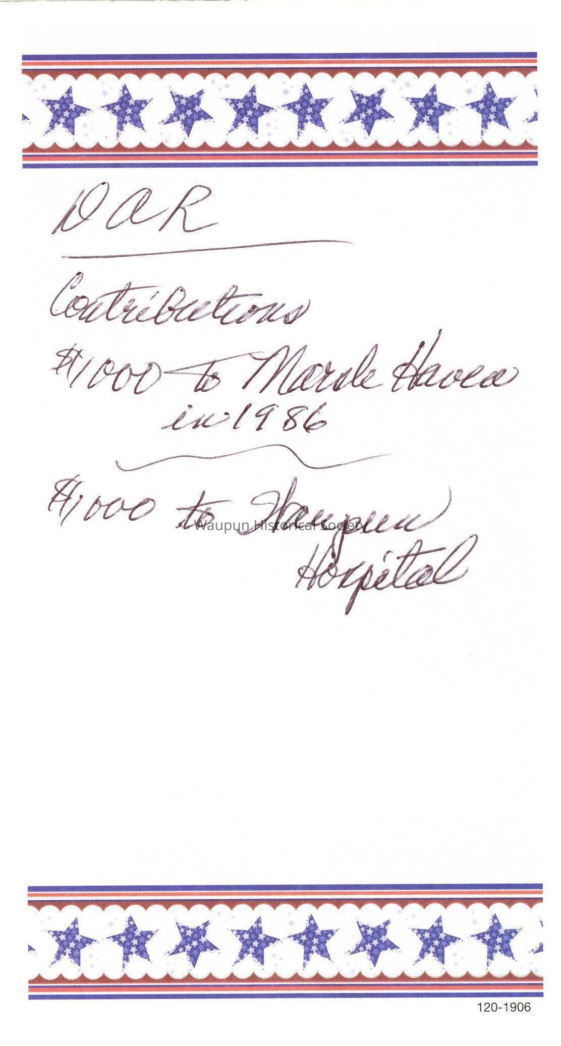 Handwritten information on red, white and blue boarder notepad - DAR contributions - $1000 to Marsh Haven in 1986 and $1000 to Waupun Hospital.Acquisition