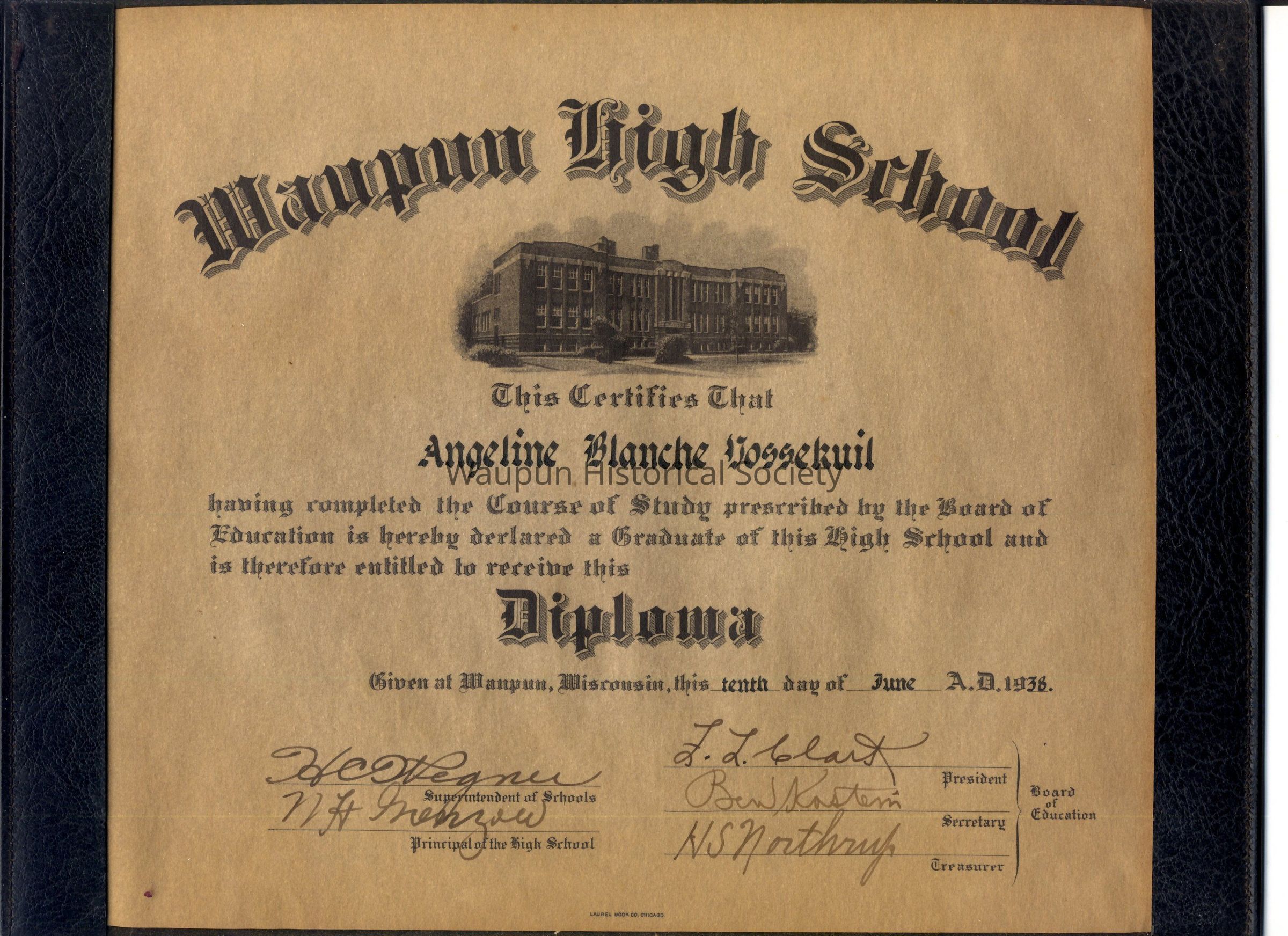 Waupun High School Diploma for Angeline Blanche Vossekuil of June 10, 1938. The certificate has a picture of the Waupun High School along with typed - This Certifies That Angeline Blanche Vossekuil having completed the Course of Study prescribed by the Board of Education is hereby declared a Graduate of this High School and is therefore entitled to receive this Diploma. Given at Waupun, Wisconsin, this tenth day of June A.D. 1938. Signatures of Superintendent of Schools, HC Wegner; Principal of the High School, W.H. Grenzow; Board of Education President, F.L. Clark; Secretary Ben Kastein; Treasurer, HS Northrup.