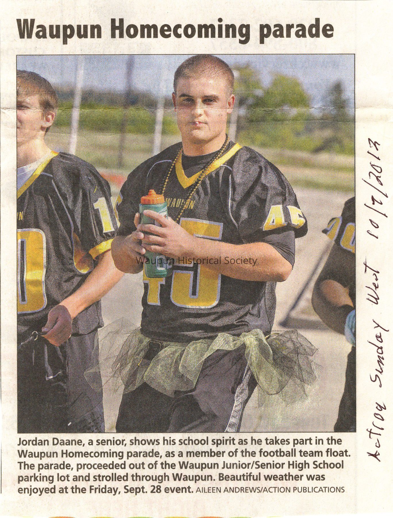 Jordan Daane, a senior, shows his school spirit as he takes part in the Waupun Homecoming parade, as a member of the football team float. The parade, proceeded out of the Waupun Junior/Senior High School parking lot and strolled through Waupun. Beautiful weather was enjoyed at the Friday, Sept. 28 event.