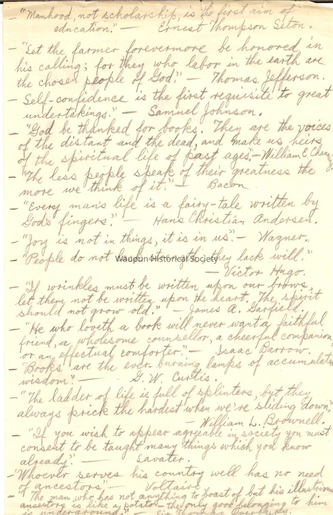 Selections from the Elbert Hubbard Scrap Book. Hand written on both sides in pencil, writer unknown. Twentyfour quotes of multiple authors.
