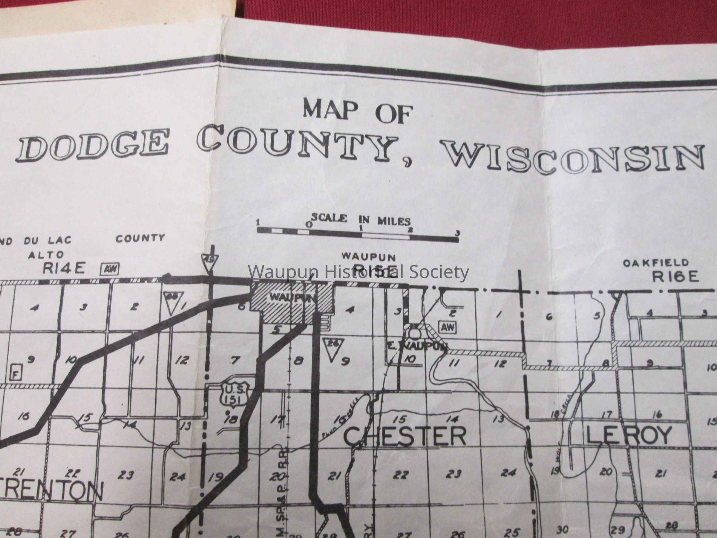Map of Dodge County, Compliments of Walter Oberdiek, County Clerk. It is folded to appear to be a pamphlet so will take photos of it open and file in museum photo files upstairs at Carnegie Museum. A photo of Walter Oberdiek is on the front. There is no date indicated anywhere on the map.Acquisition