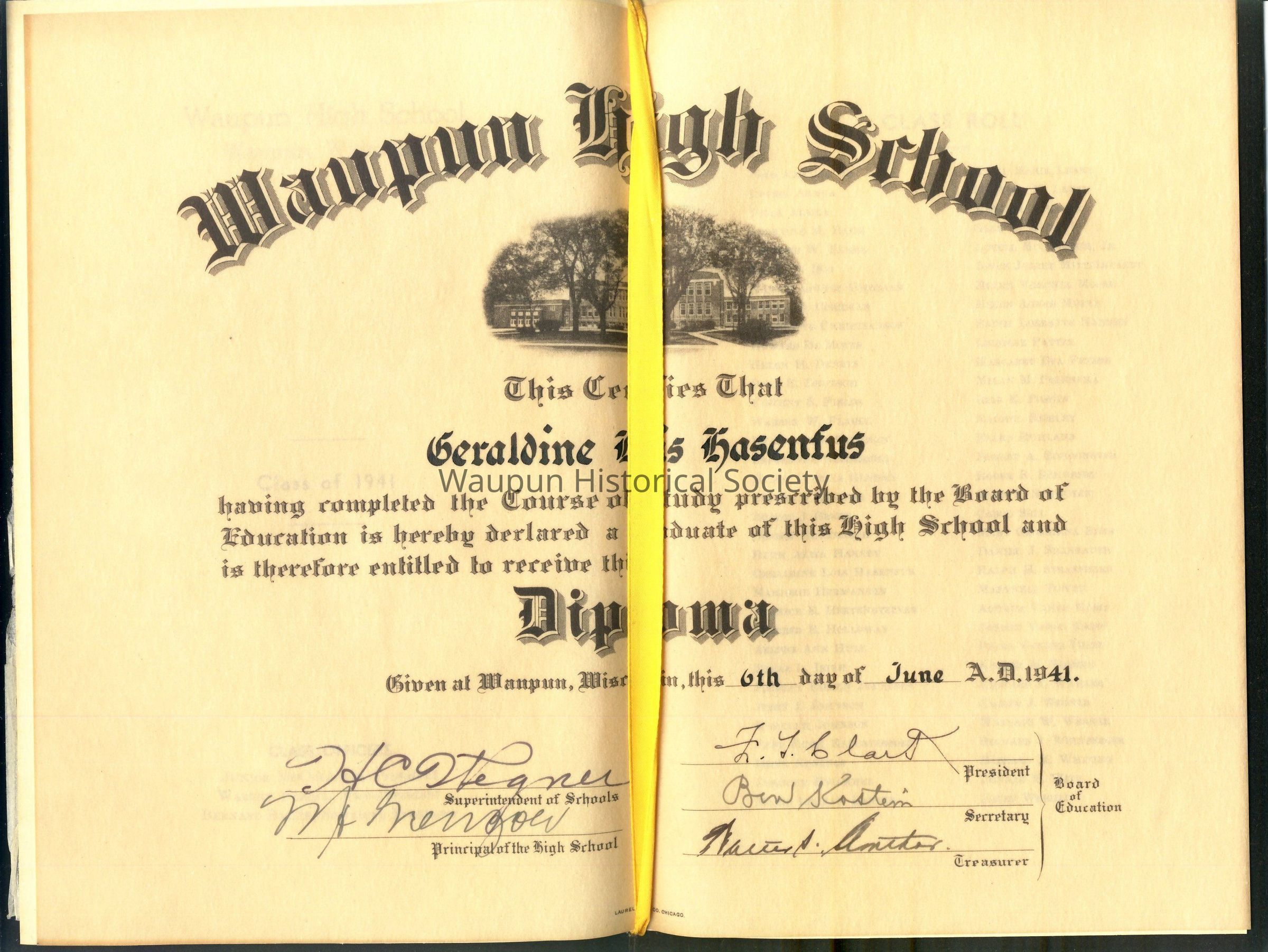 Diploma, Waupun High School, Geraldine Hasenfus, Class of 1941Entry/Object ID