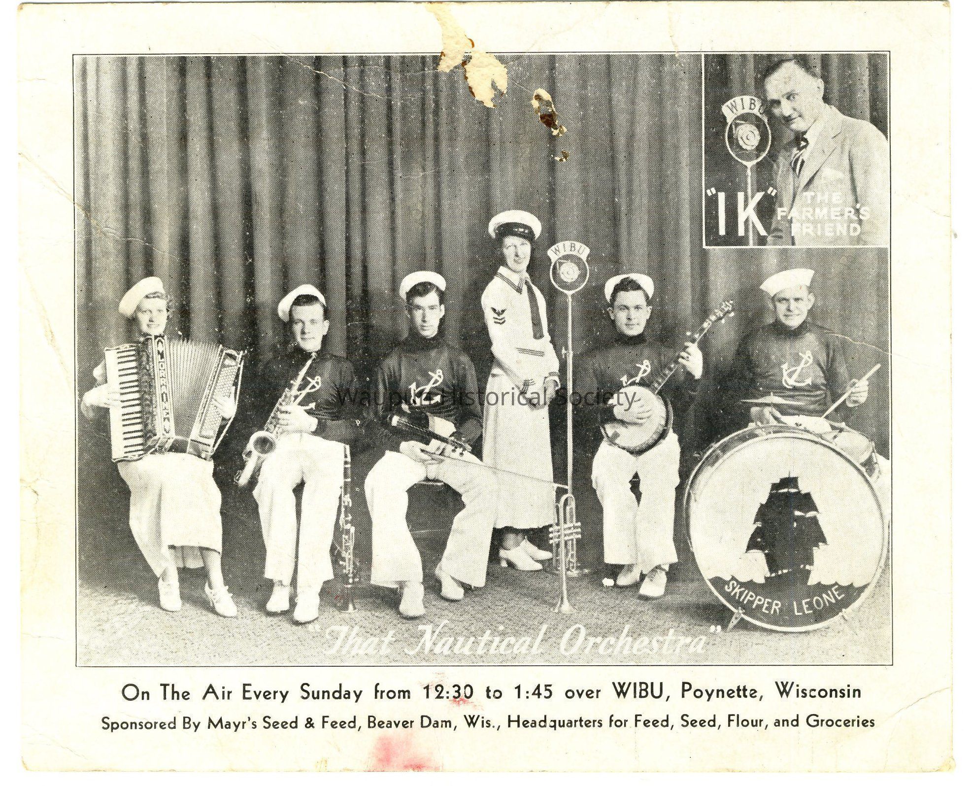 Description of photo postcard: SKIPPER LEONE AND HER DECK HANDS "That Nautical Orchestra" - shows 4 men sitting, holding a musical instrument and 2 women, 1 playing an accordian and one standing by the microphone. The bass drum has a picture of ship and the name SKIPPER LEONE on it. In the upper right corner is a small photo of "IK" the Farmer's Friend, a man standing by the WIBU microphone.