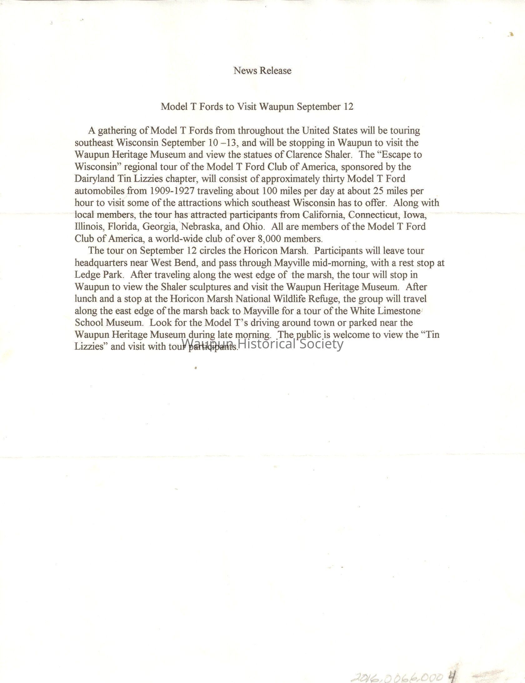 News release for The Tin Lizzies chapter of the Model T Ford Club of America as sent to the Waupun Heritage Museum, prior to the September event.Acquisition