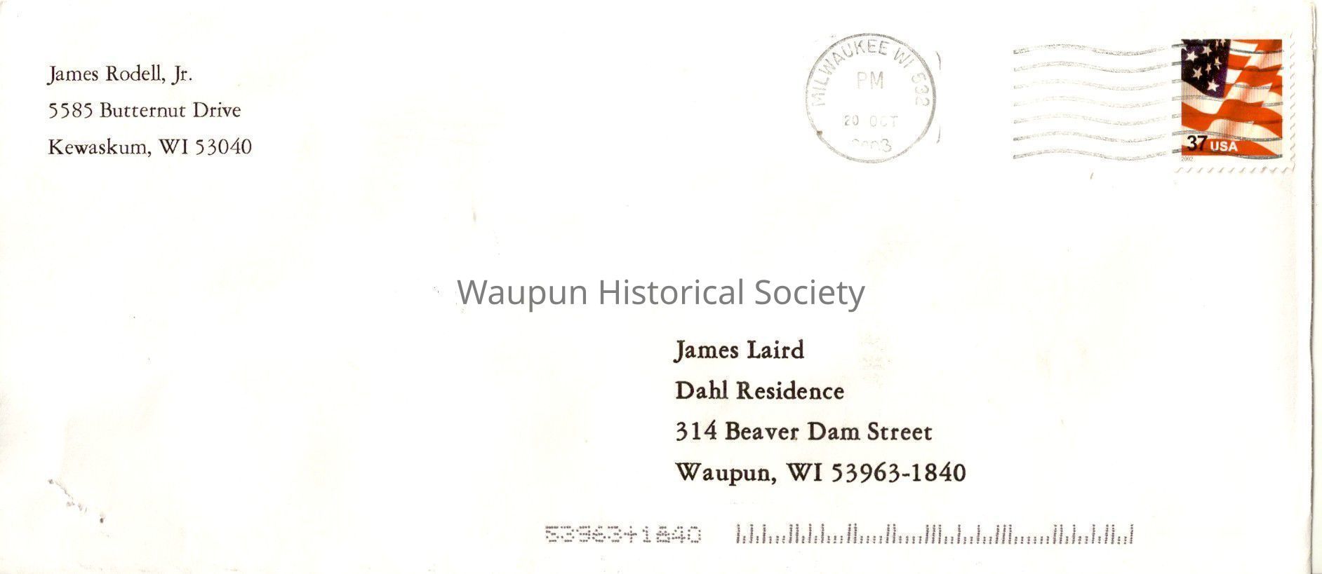 Envelope from correspondence with James Rodell, Jr. President of the "Tin Lizzies" auto club. Addressed to James Laird postmarked Oct. 20, 2003 at Milwaukee WI. Envelope with Thank you letter and donation from the "Tin Lizzies" Club to the Waupun Historical Museum/Society