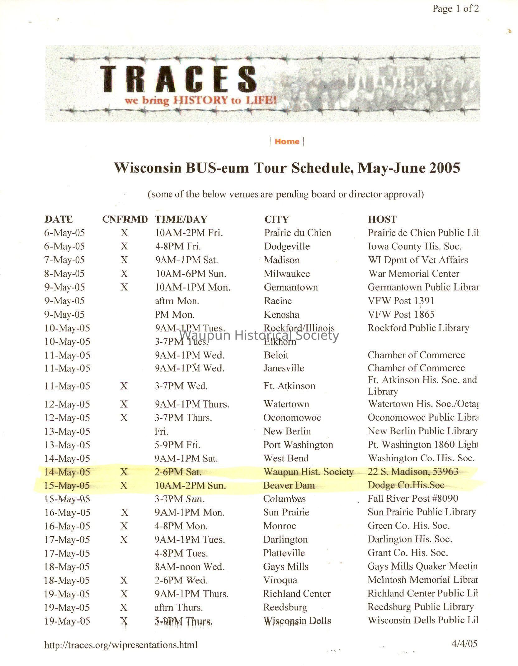 This is a two page document listing the date, time/day, city and host for the BUS-eum Tour. Compiled by the Traces organization, sponsor of the traveling museum, the dates range from May 6,2005 - June 11, 2005. At the time of this release, April 4, 2005 not all locations were confirmed. Only the first page with the Waupun destination was scanned but the second page is available upon request.Acquisition