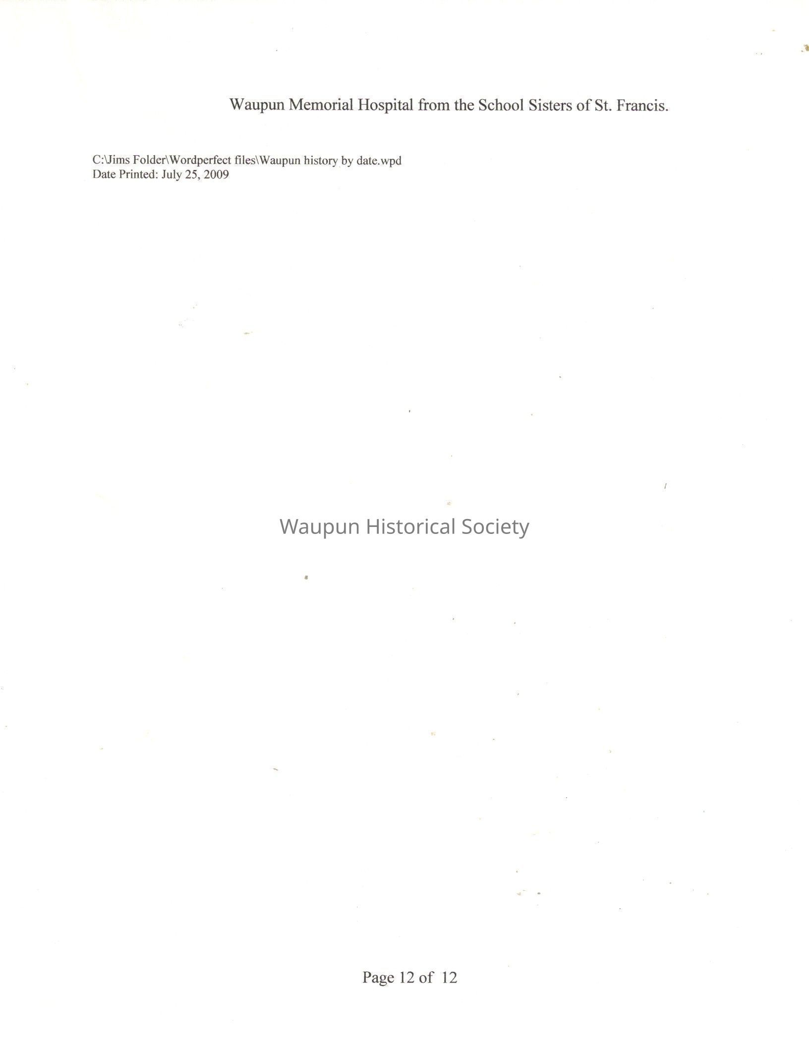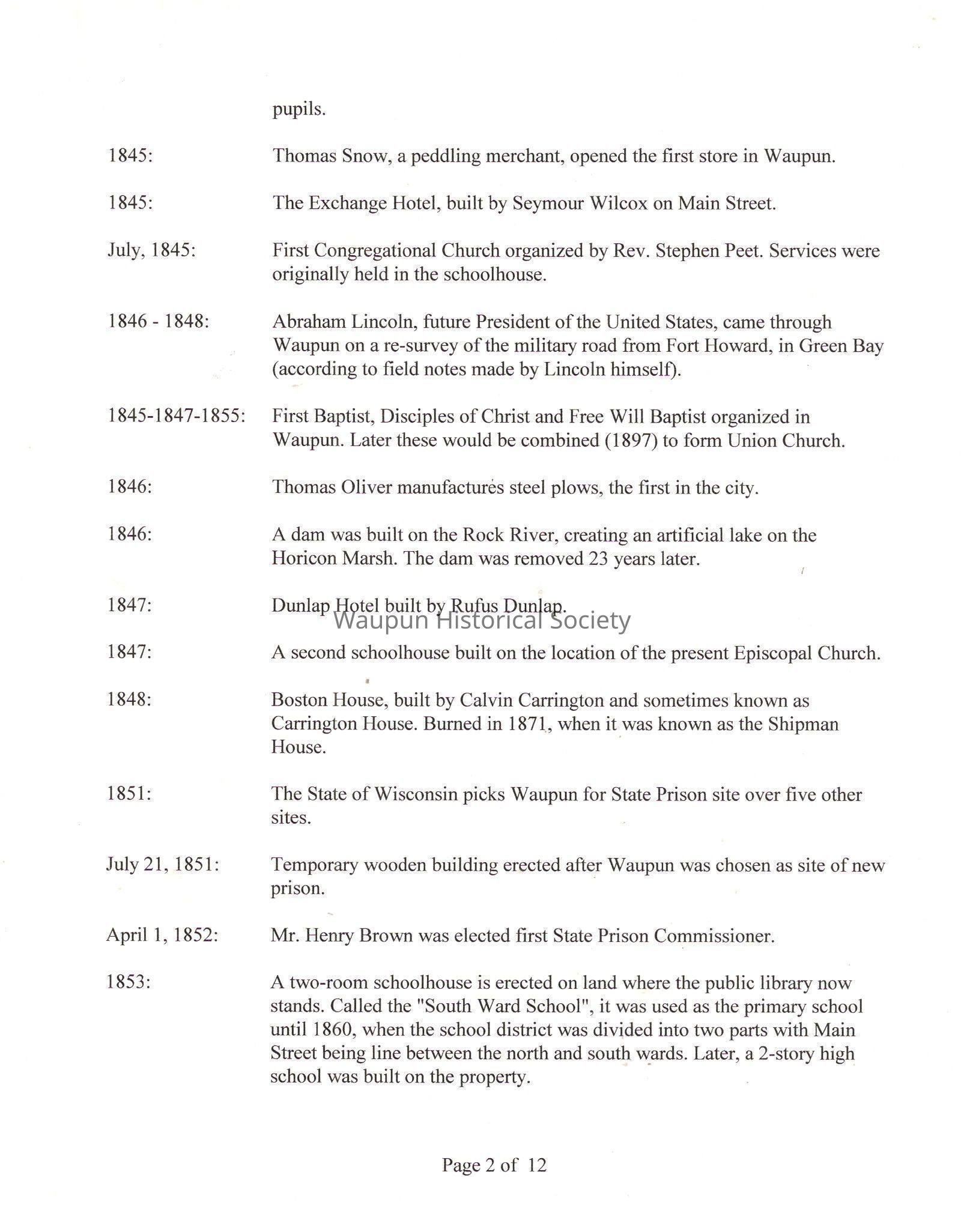 Time line style history of Waupun 1839 - 1987 by Briton Mohr. The 12 page document highlights events of Waupun from the arrival of Seymour Wilcox and Ackerman and Hiram Walker in 1839, the first wedding, first male child, shops and mills, school houses and hotels, banks and churches, dedications of Waupun Statues,etc. Time line concludes with St. Agnes assuming sponsorship of Waupun Memorial Hospital in 1987.