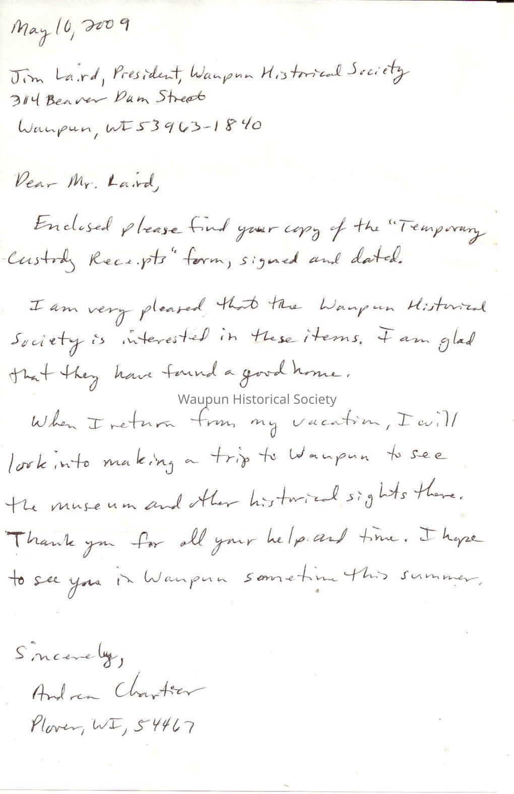 Hand written letter from Andrea Chartier to Jim Laird returning the signed Temporary Custody Receipt donating the items from "Handcrafters" of Waupun circa 1940.May 10, 2009