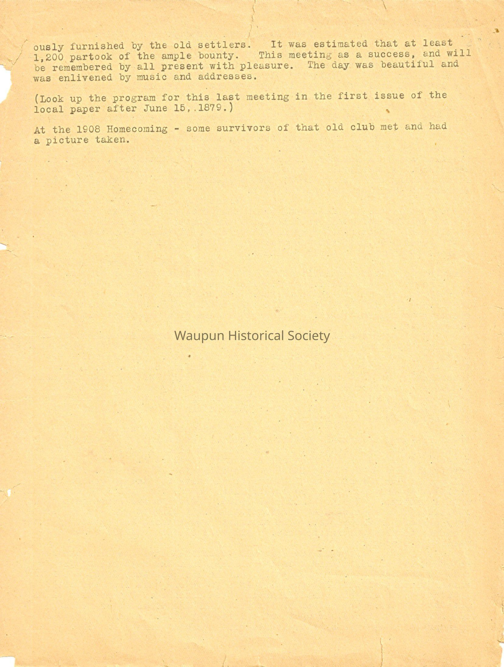 On the 8th day of February, 1875, many citizens of Waupun and vicinity who had long been residents of the state, met together for the purpose of organizing an Old Settlers' Club. A Club was formed and a committee appointed to draft rules for its government. A resolution was also adopted, that all citizens of Waupun and vicinity, who had been twenty-five years residents of the State, should be entitled to membership. The meeting adjourned to February 15, 1875, for the purpose of perfecting a permanent organization.