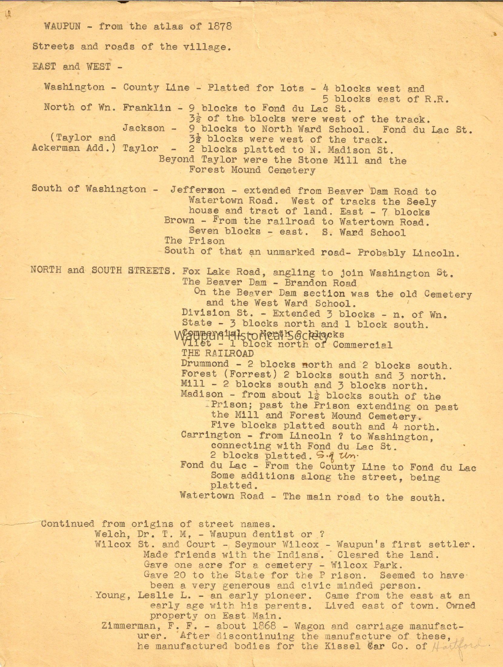 Three pages of documentation of the naming of streets and roads in Waupun begins with an alphabetized listing, Ackerman through Reinhardt. Each name is followed by the significance of the person for whom the street was named.