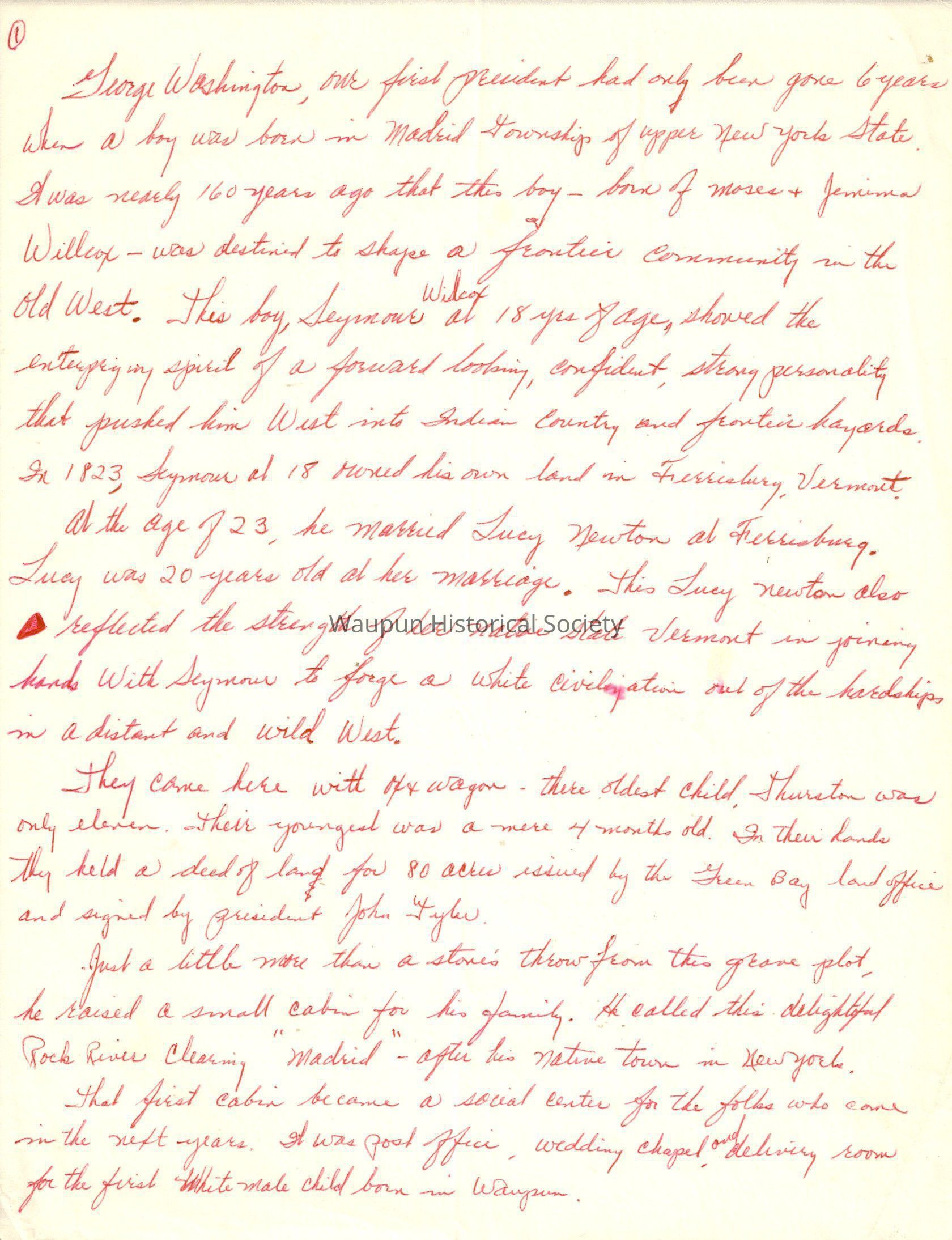 They came here with ox and wagon. There oldest child, Thurston was only eleven. Their youngest was a mere 4 months old. In their hands they held a deed of land for 80 acres issued by the Green Bay land office and signed by president John Tyler.