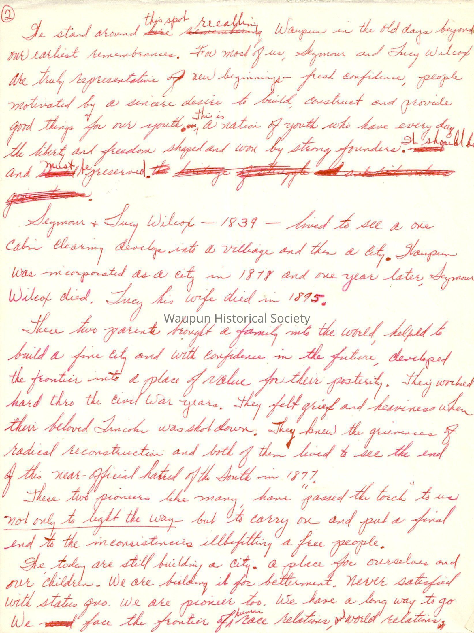 Seymour & Lucy Wilcox - 1839 - lived to see a one cabin clearing develop into a village and then a city. Waupun was incorporated as a city in 1878 and one year later, Seymour Wilcox died. Lucy his wife died in 1895.