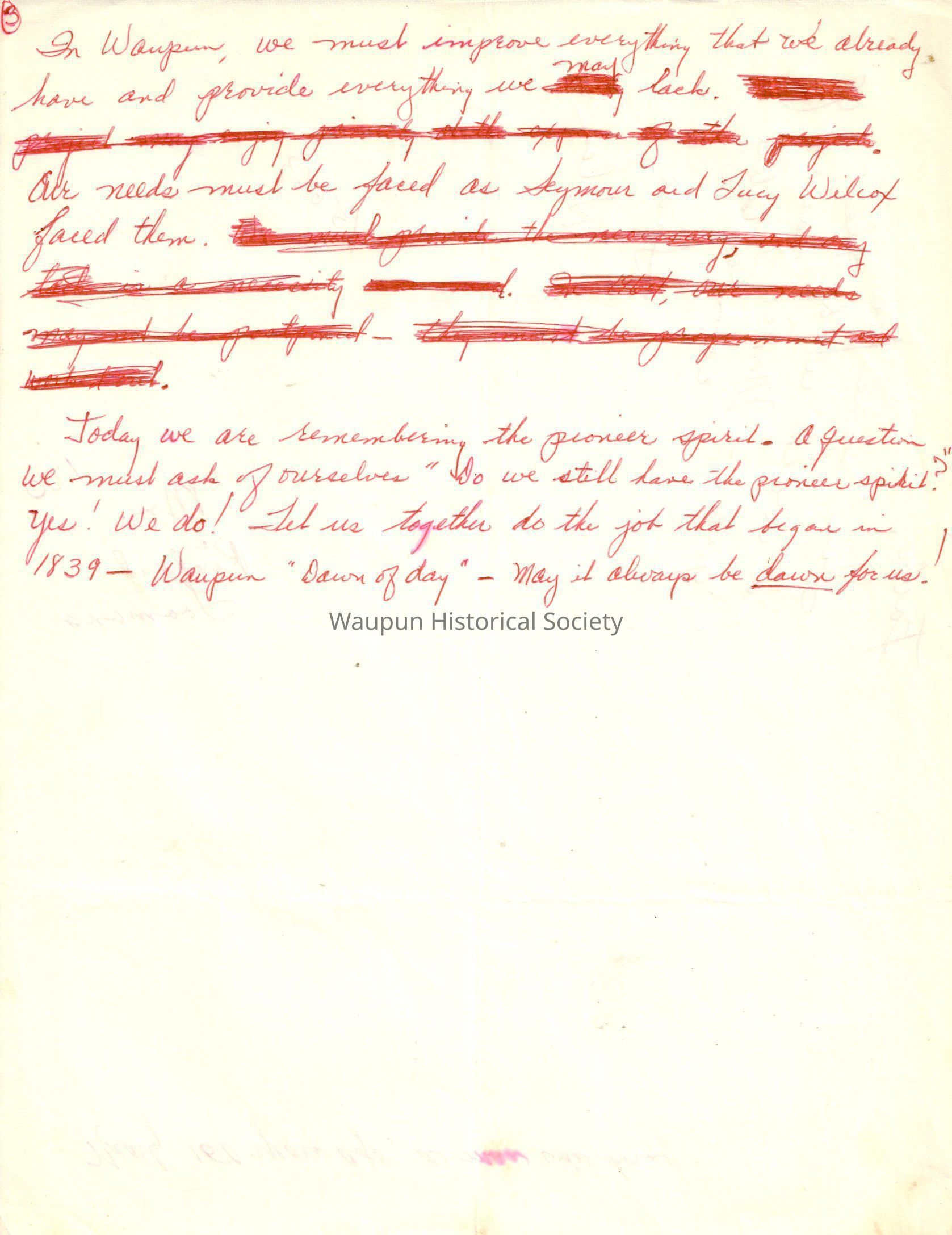 Today we are remembering the pioneer spirit. A question we must ask of ourselves "Do we still have the pioneer spirit?" Yes! We do! Let us together do the job that began in 1839 - Waupun "Dawn of day" - May it always be dawn for us!