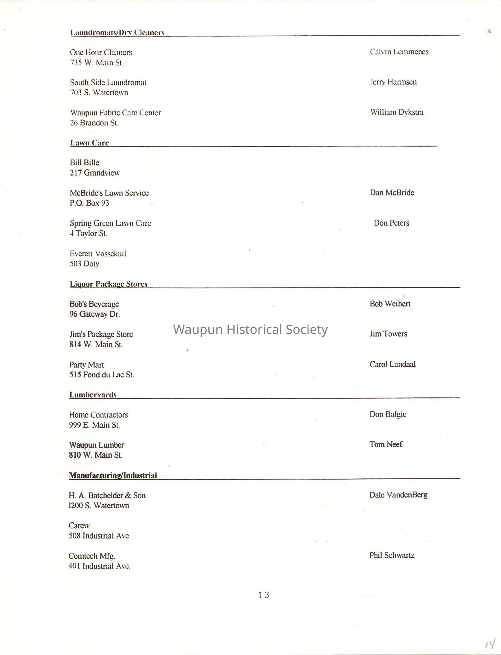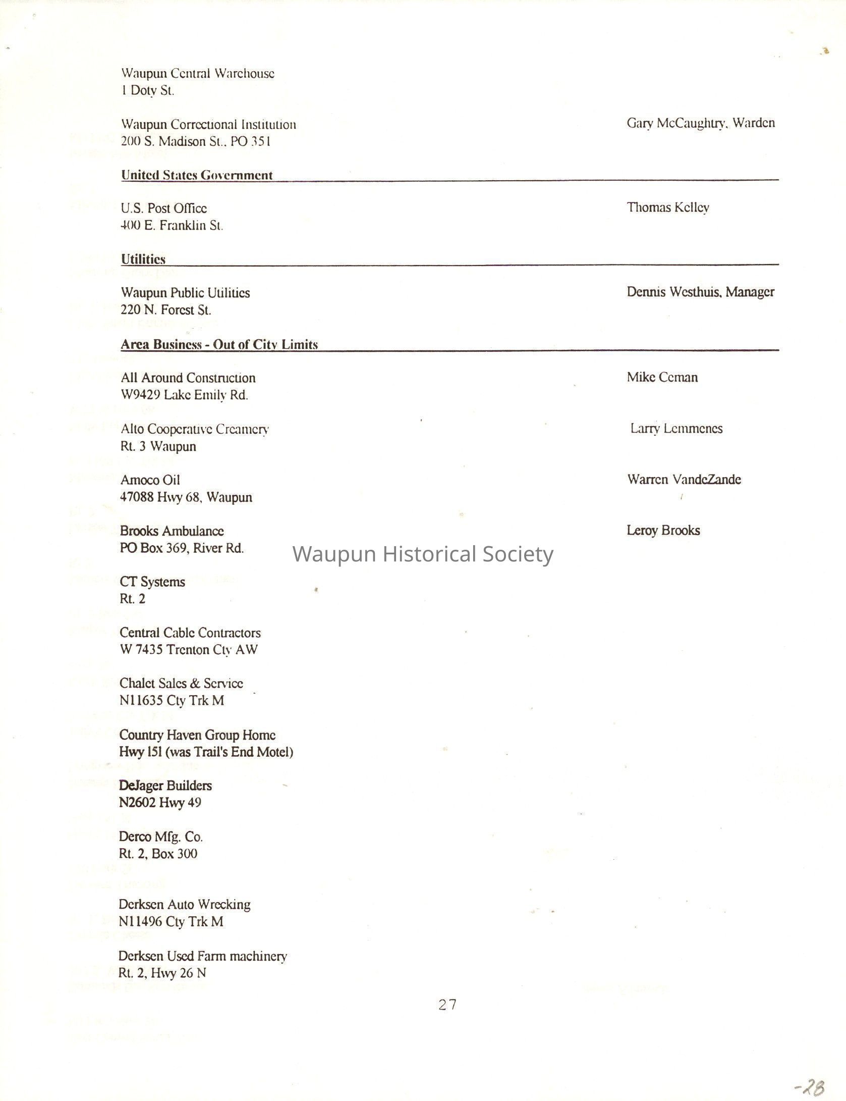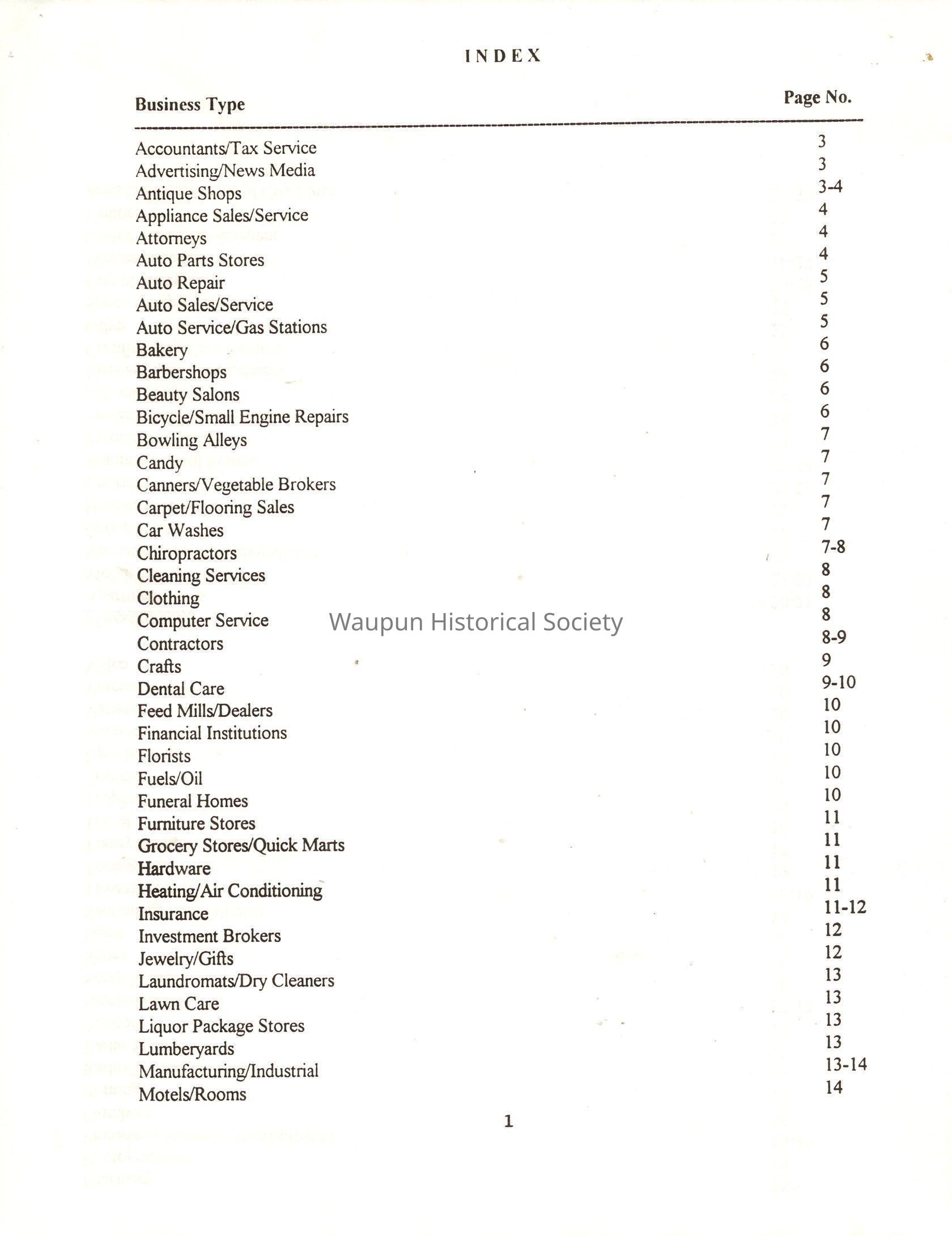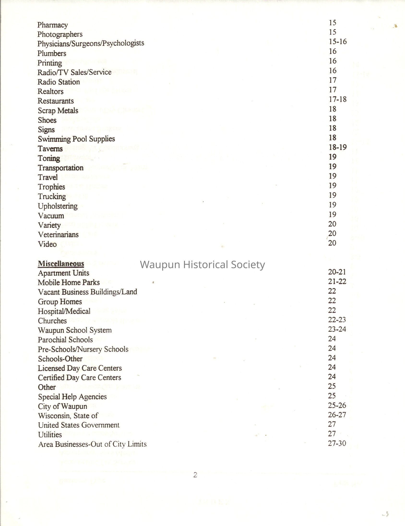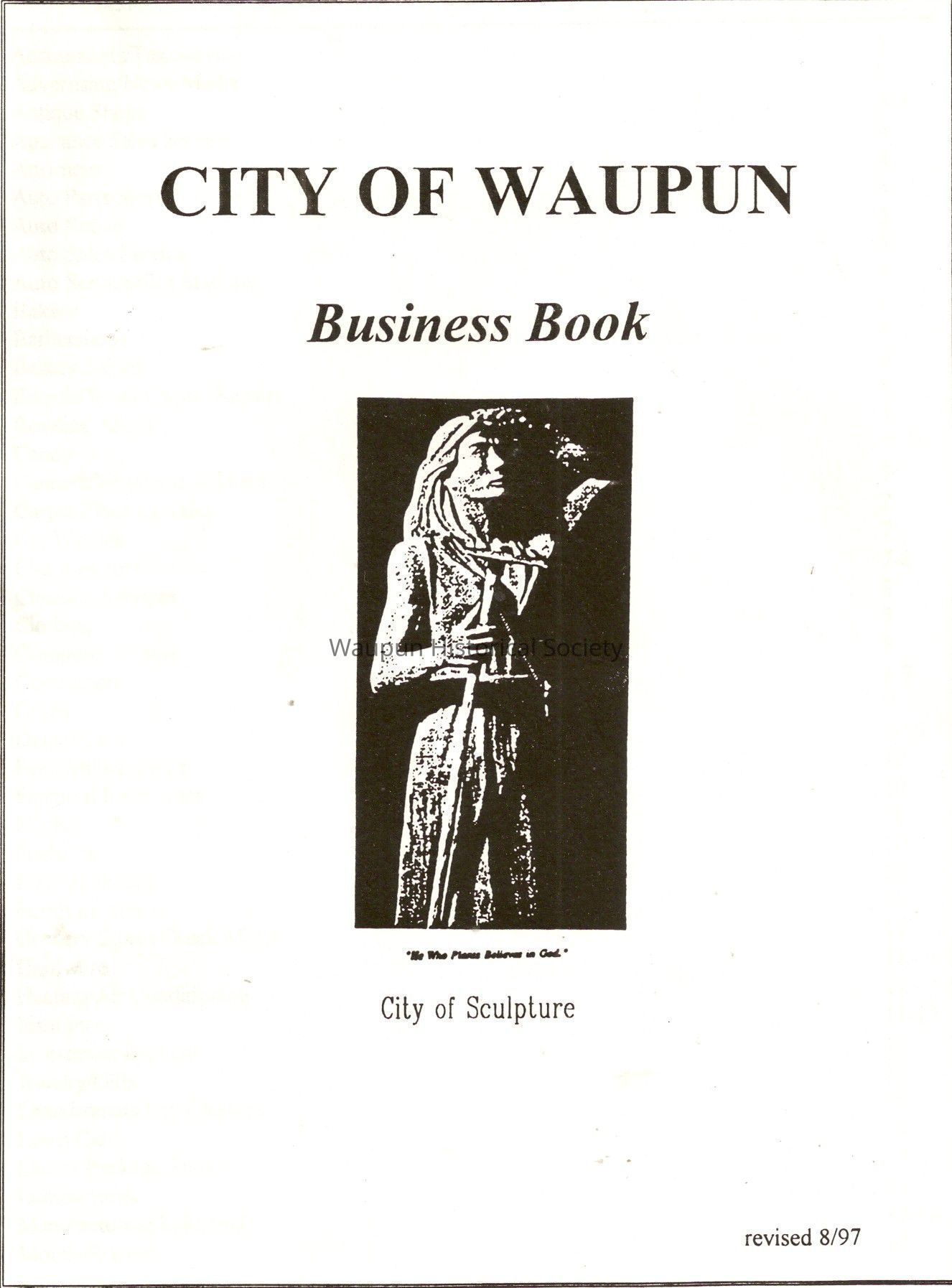 "City of Waupun Business Book" listing all businesses, addresses and owners/managers. Listed in alphabetical order by business type, shows the page number of it's listing within the book. Apartment units and mobile home parks, Vacant business buildings/land, group homes, hospital/medical,churches, the Waupun school system, parochial and pre-school/nursery and licensed day care, City of Waupun and Government offices and utilities and many miscellanious out of city limits businesses are included.