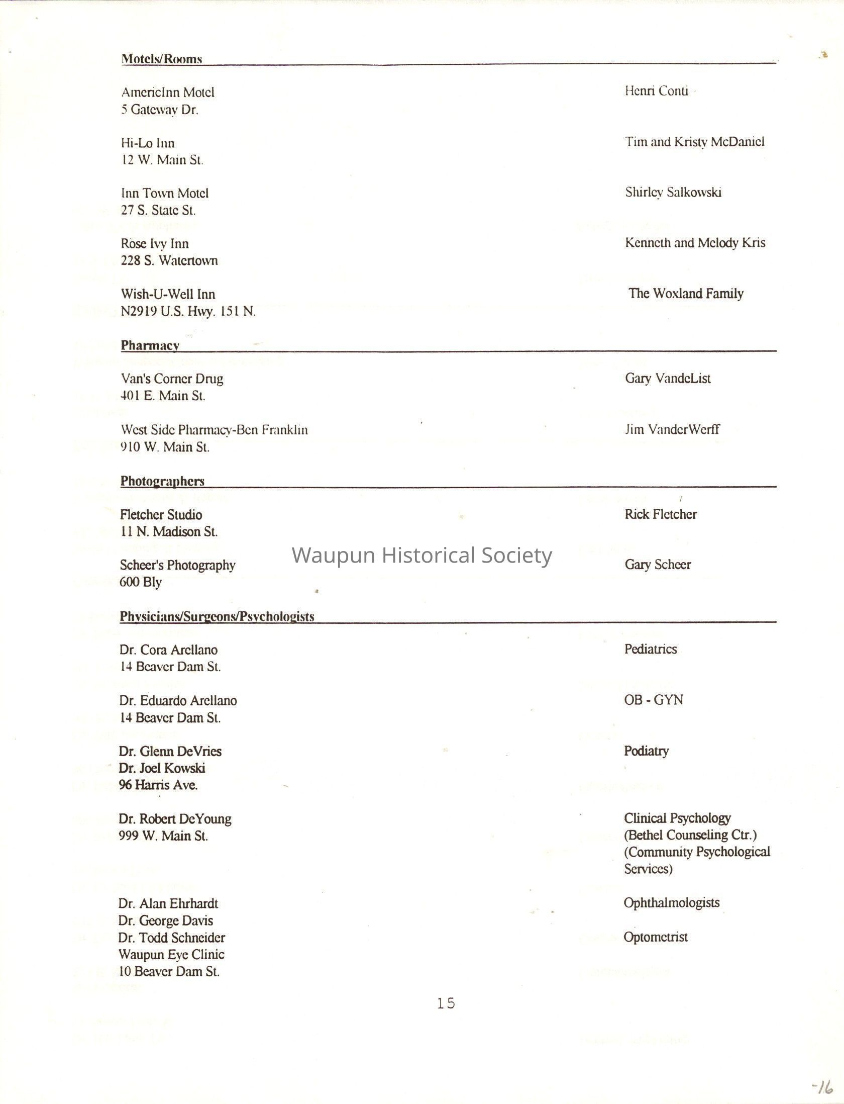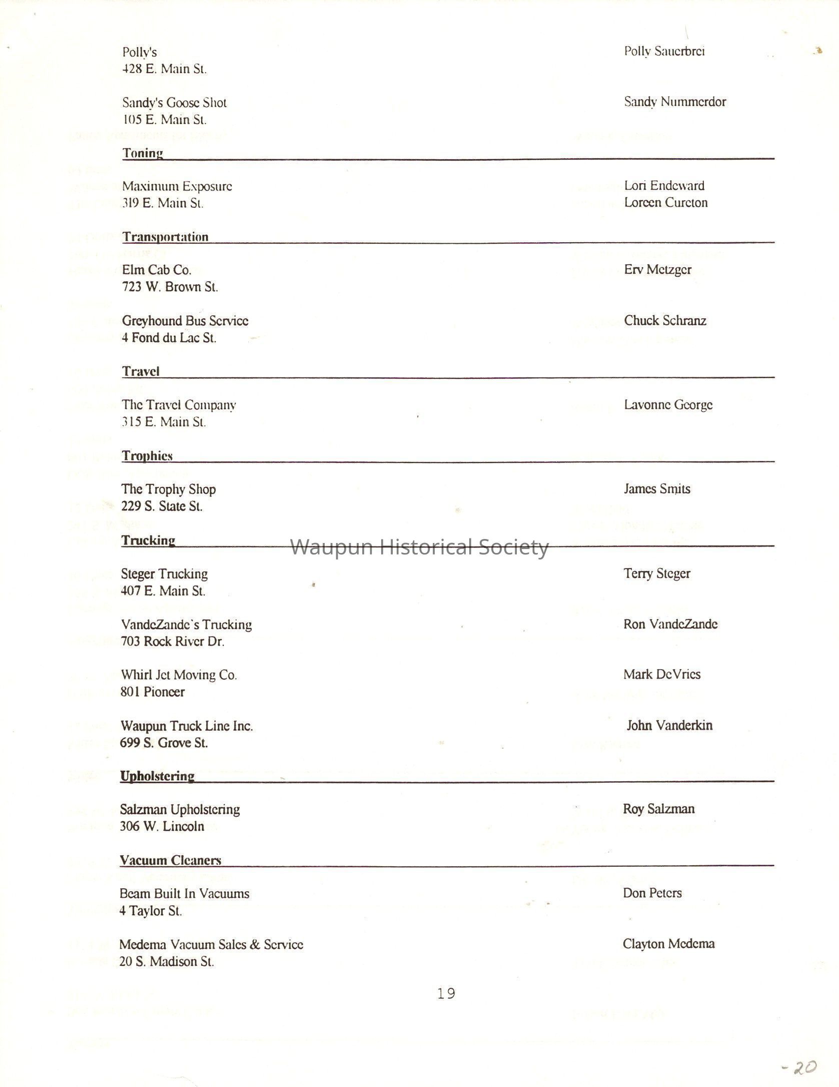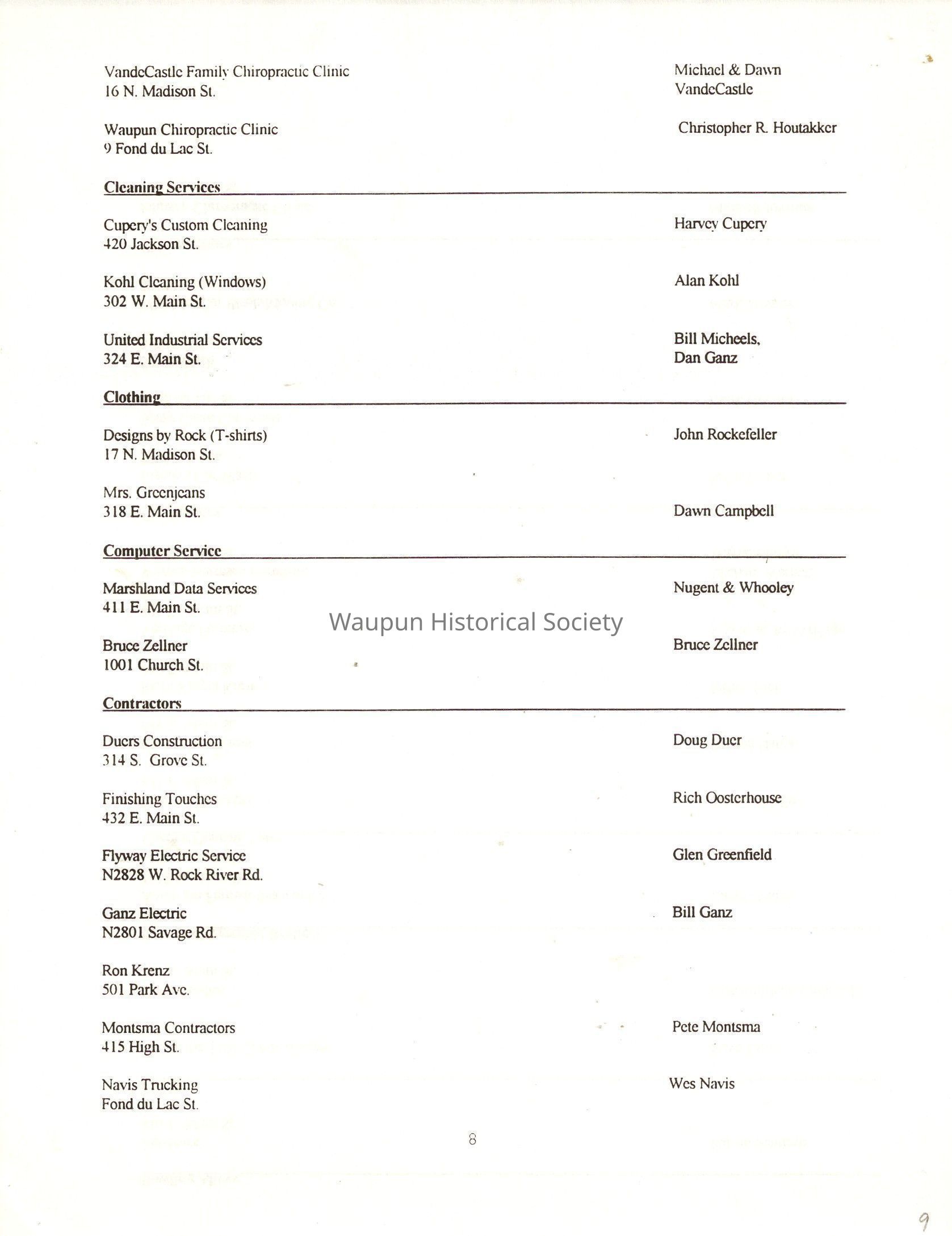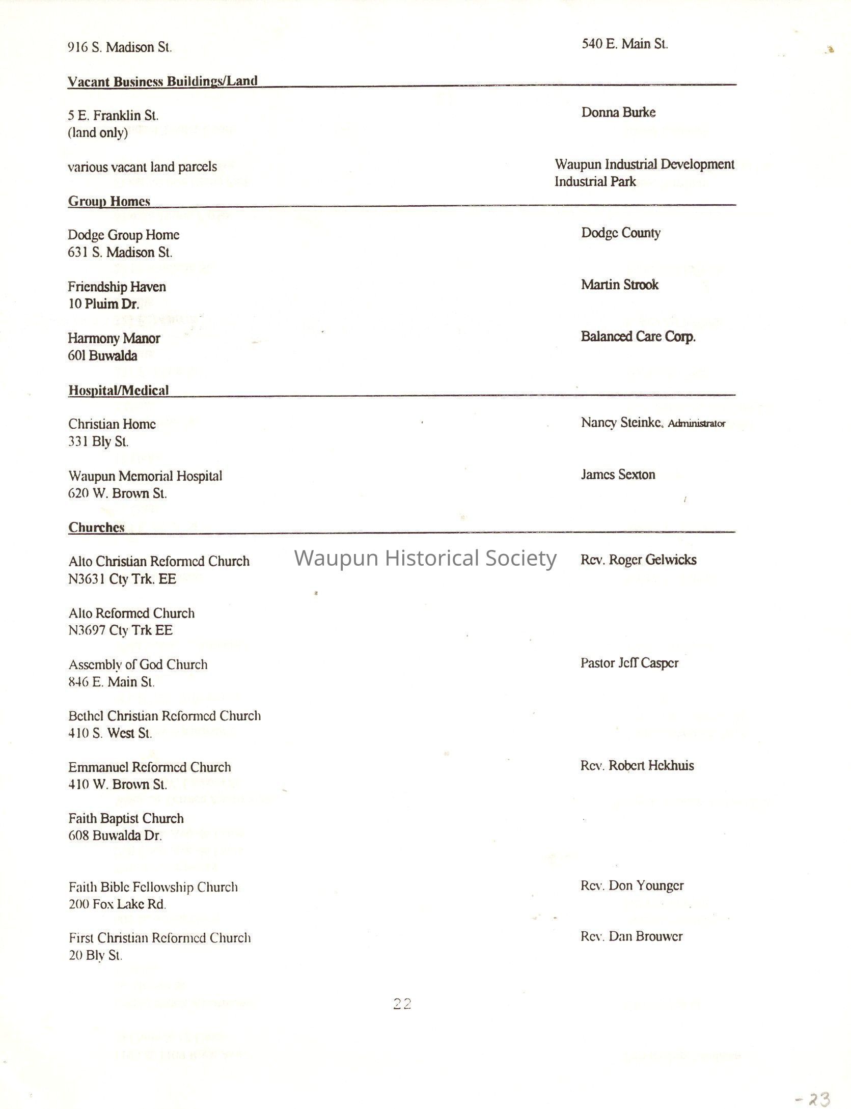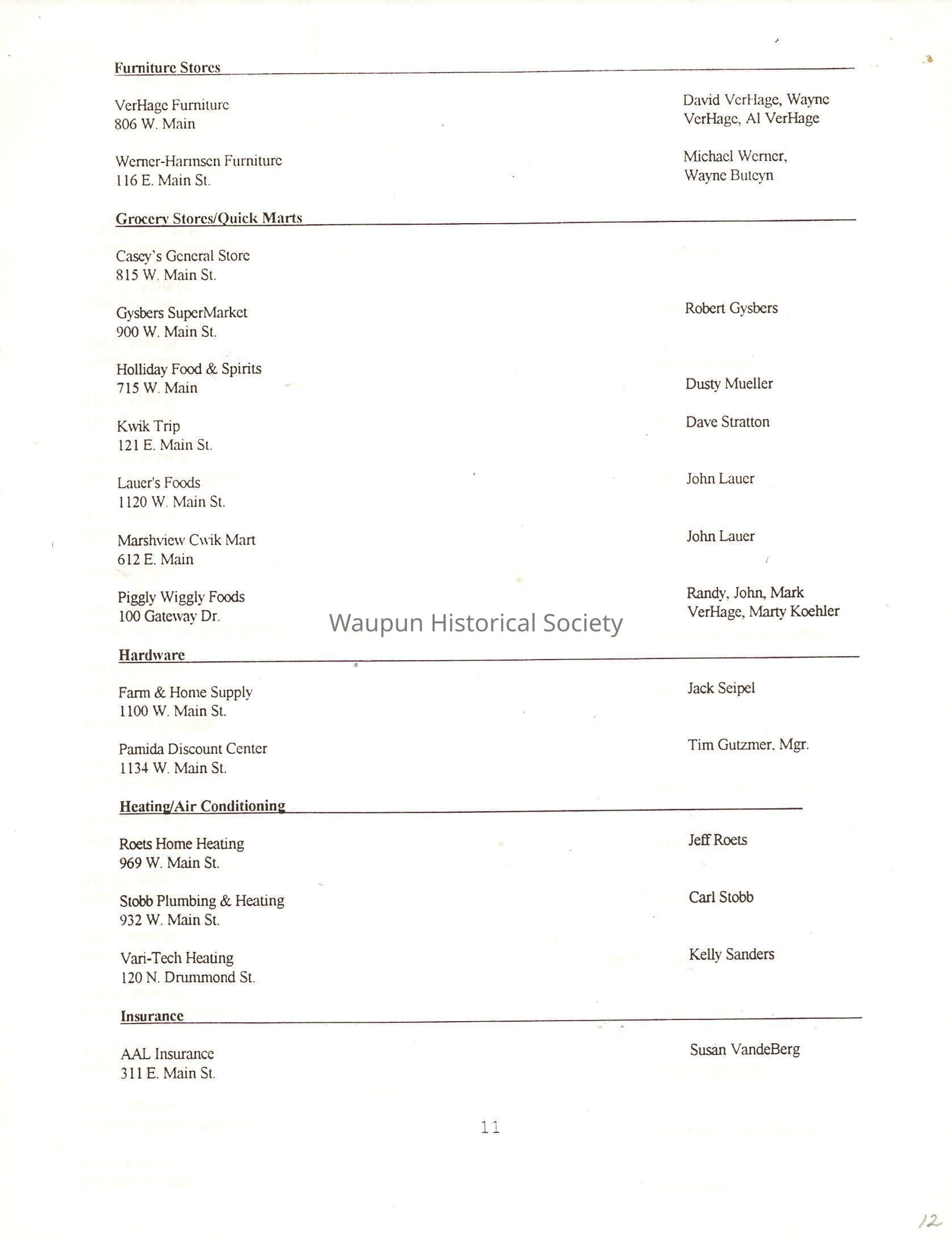 "City of Waupun Business Book" listing all businesses, addresses and owners/managers. Listed in alphabetical order by business type, shows the page number of it's listing within the book. Apartment units and mobile home parks, Vacant business buildings/land, group homes, hospital/medical,churches, the Waupun school system, parochial and pre-school/nursery and licensed day care, City of Waupun and Government offices and utilities and many miscellanious out of city limits businesses are included.