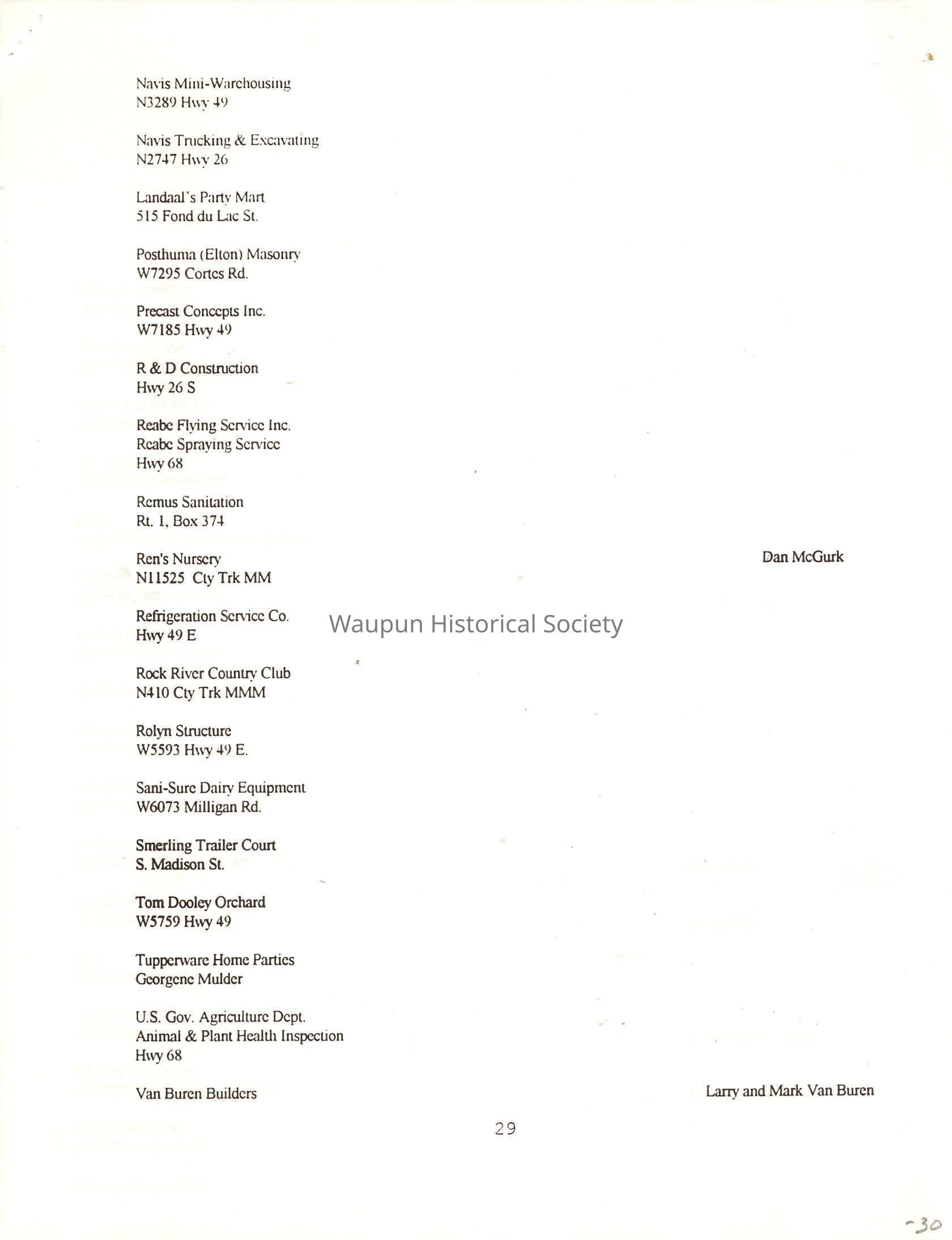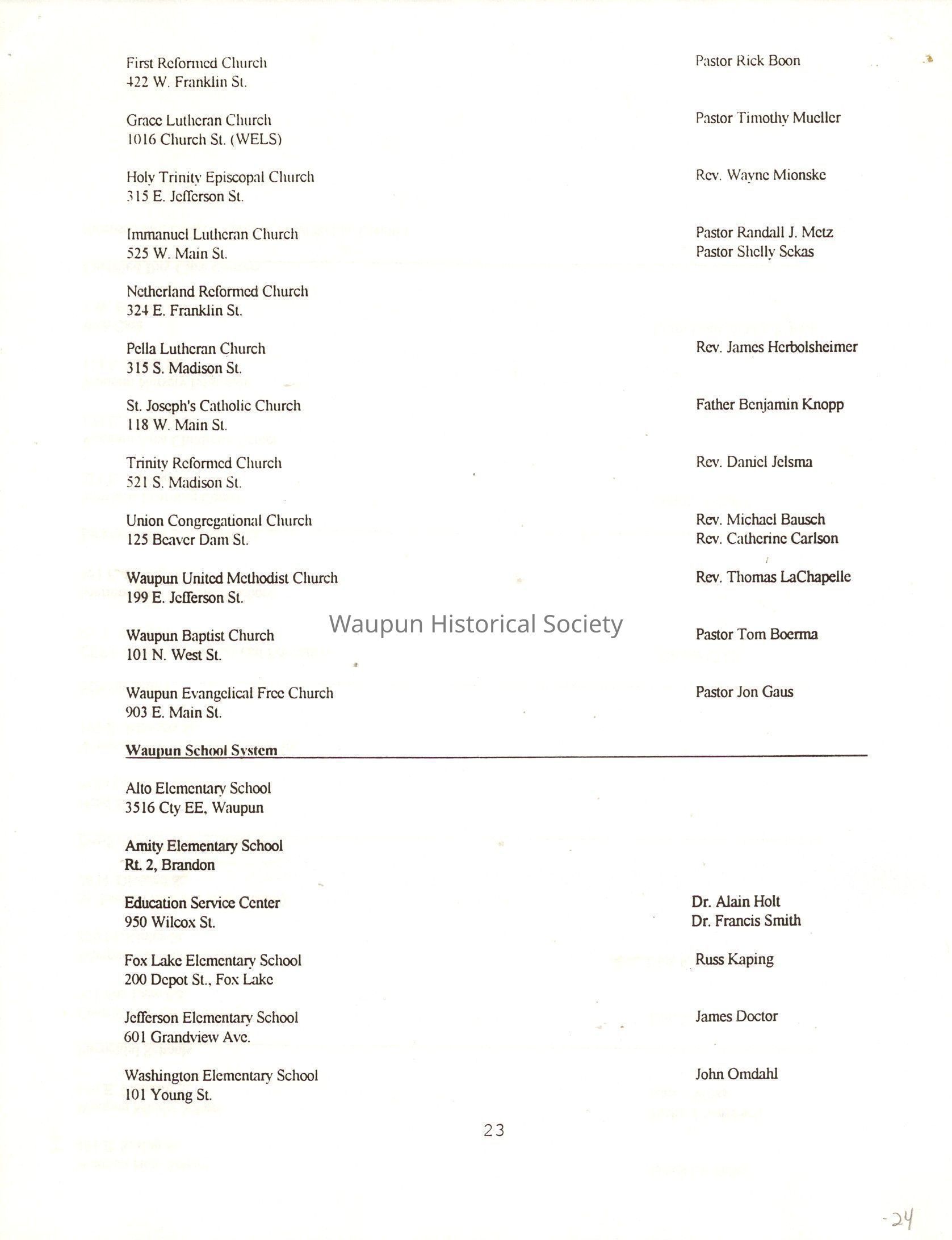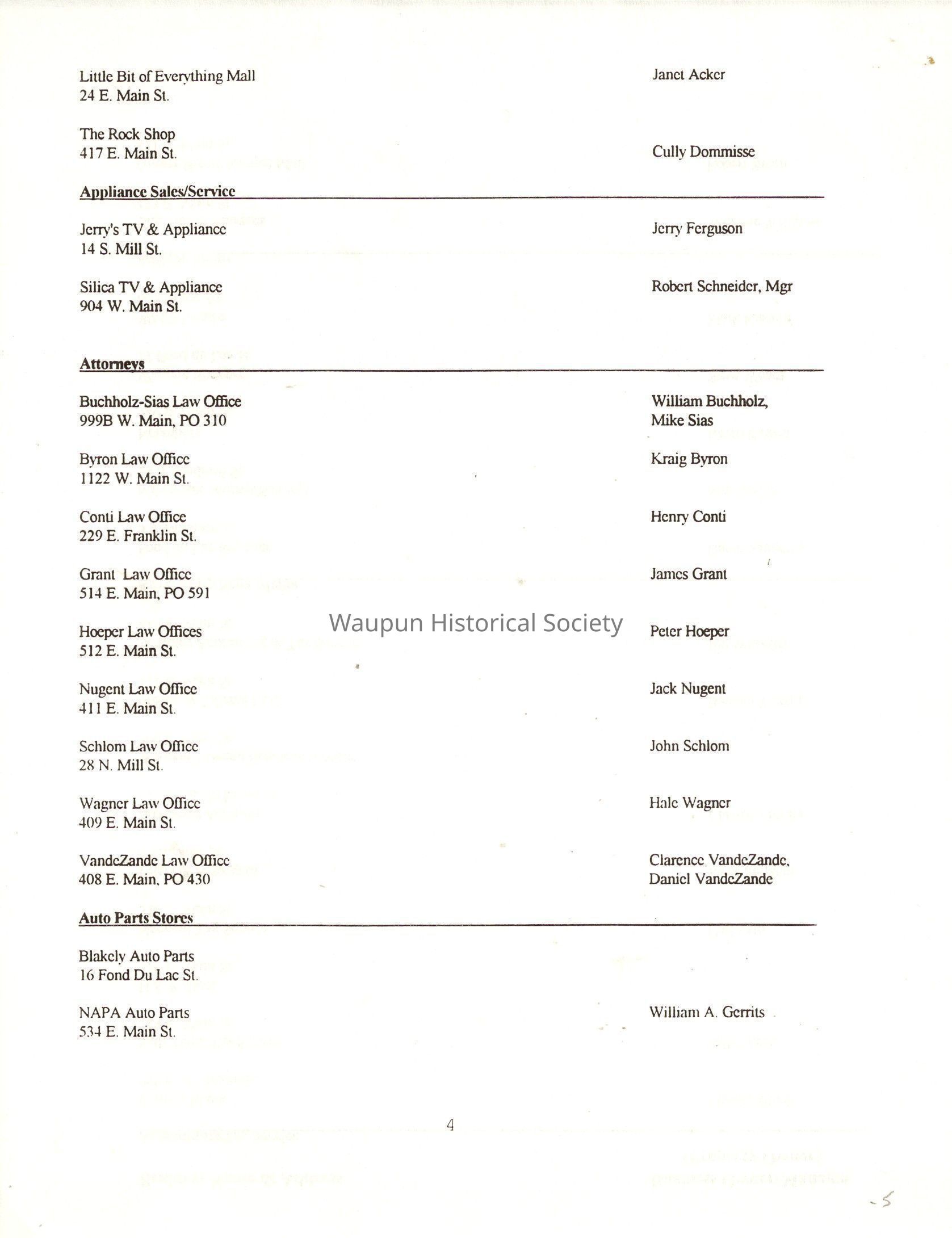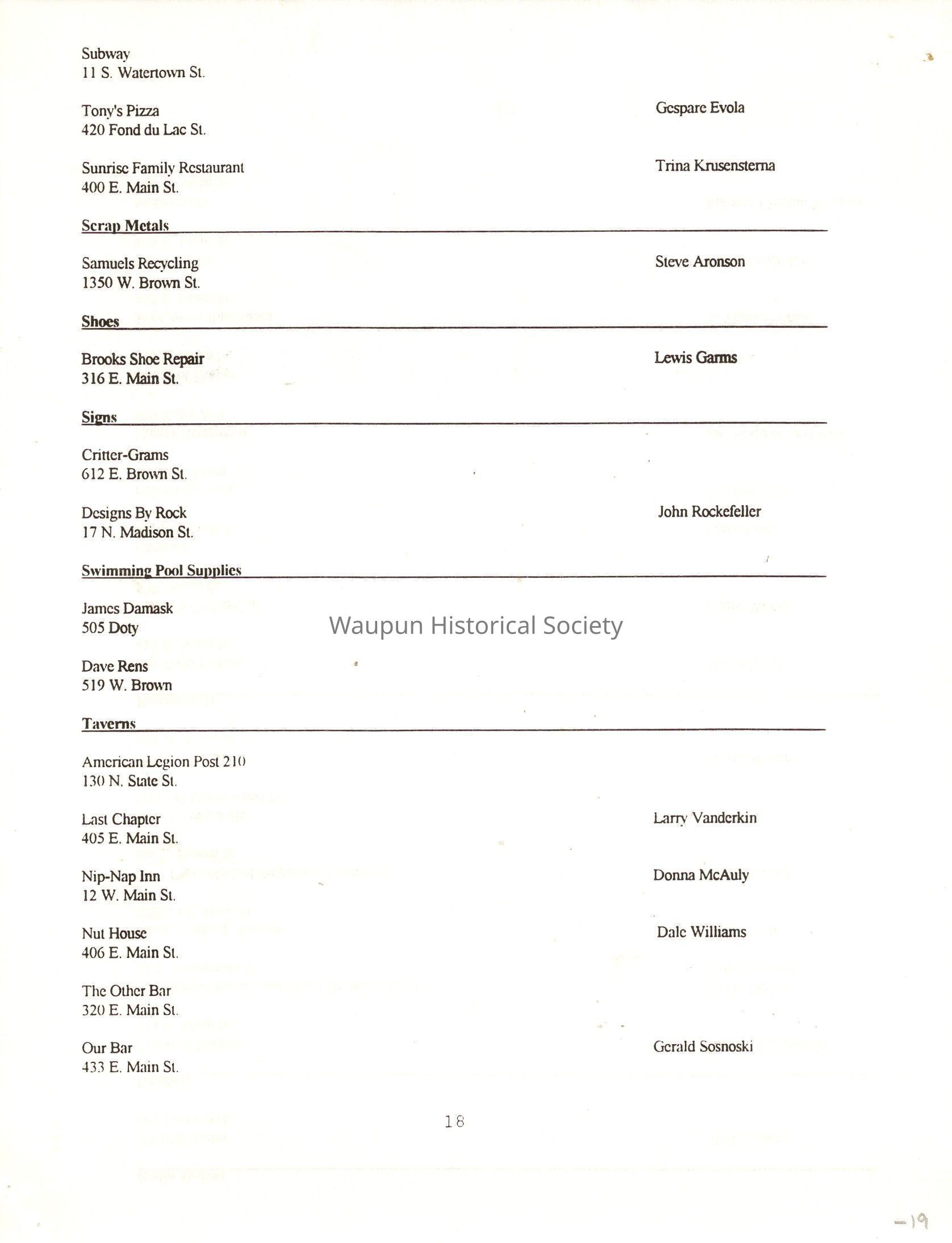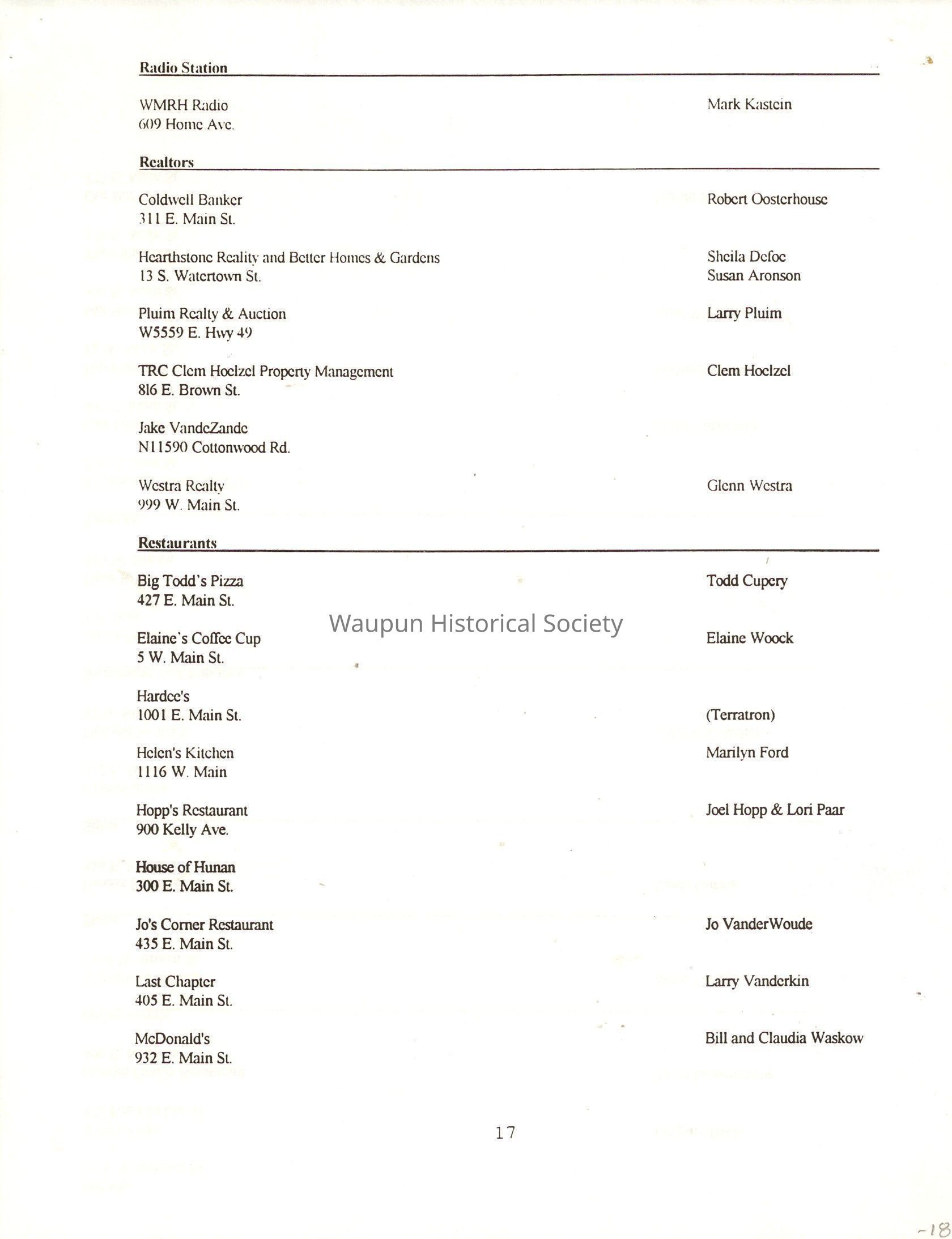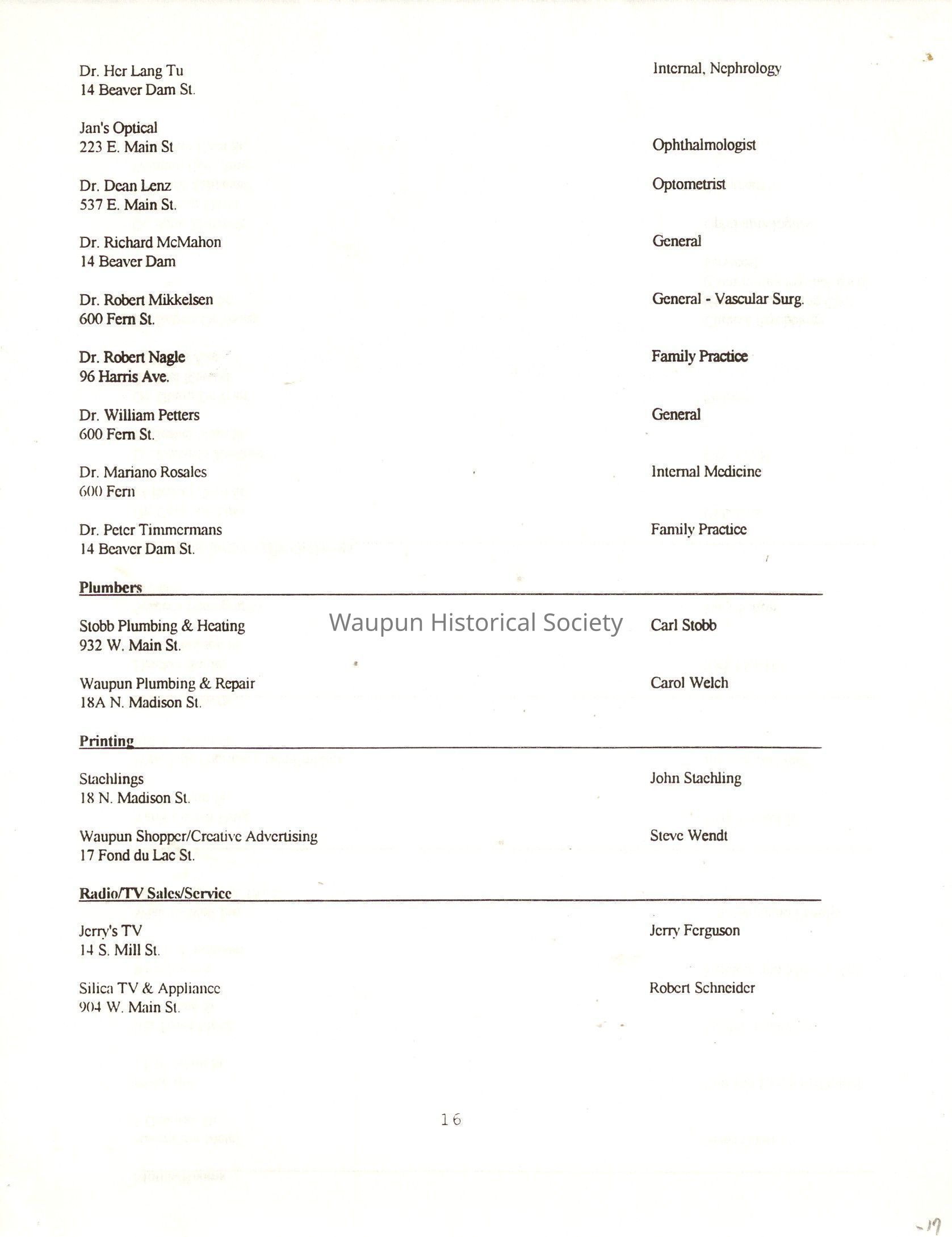 "City of Waupun Business Book" listing all businesses, addresses and owners/managers. Listed in alphabetical order by business type, shows the page number of it's listing within the book. Apartment units and mobile home parks, Vacant business buildings/land, group homes, hospital/medical,churches, the Waupun school system, parochial and pre-school/nursery and licensed day care, City of Waupun and Government offices and utilities and many miscellanious out of city limits businesses are included.