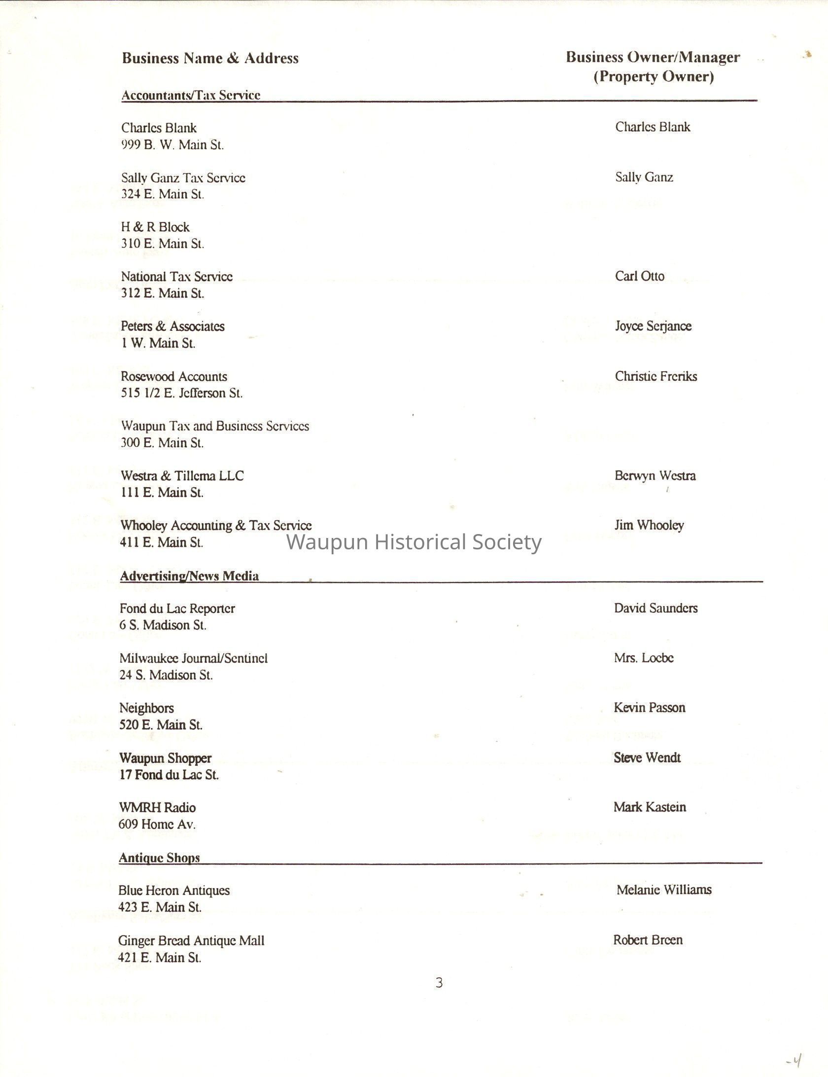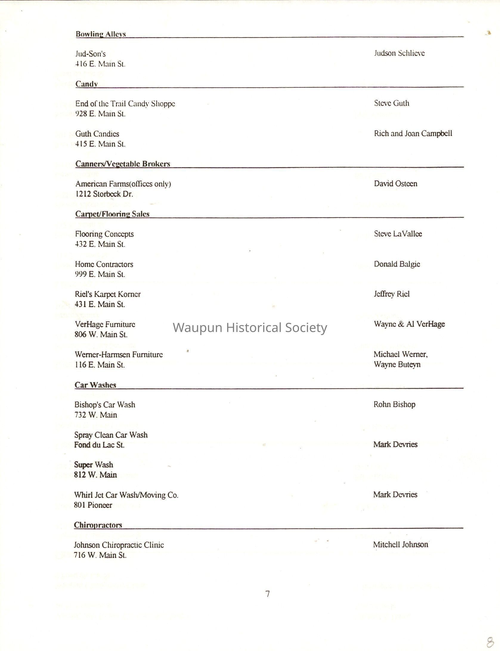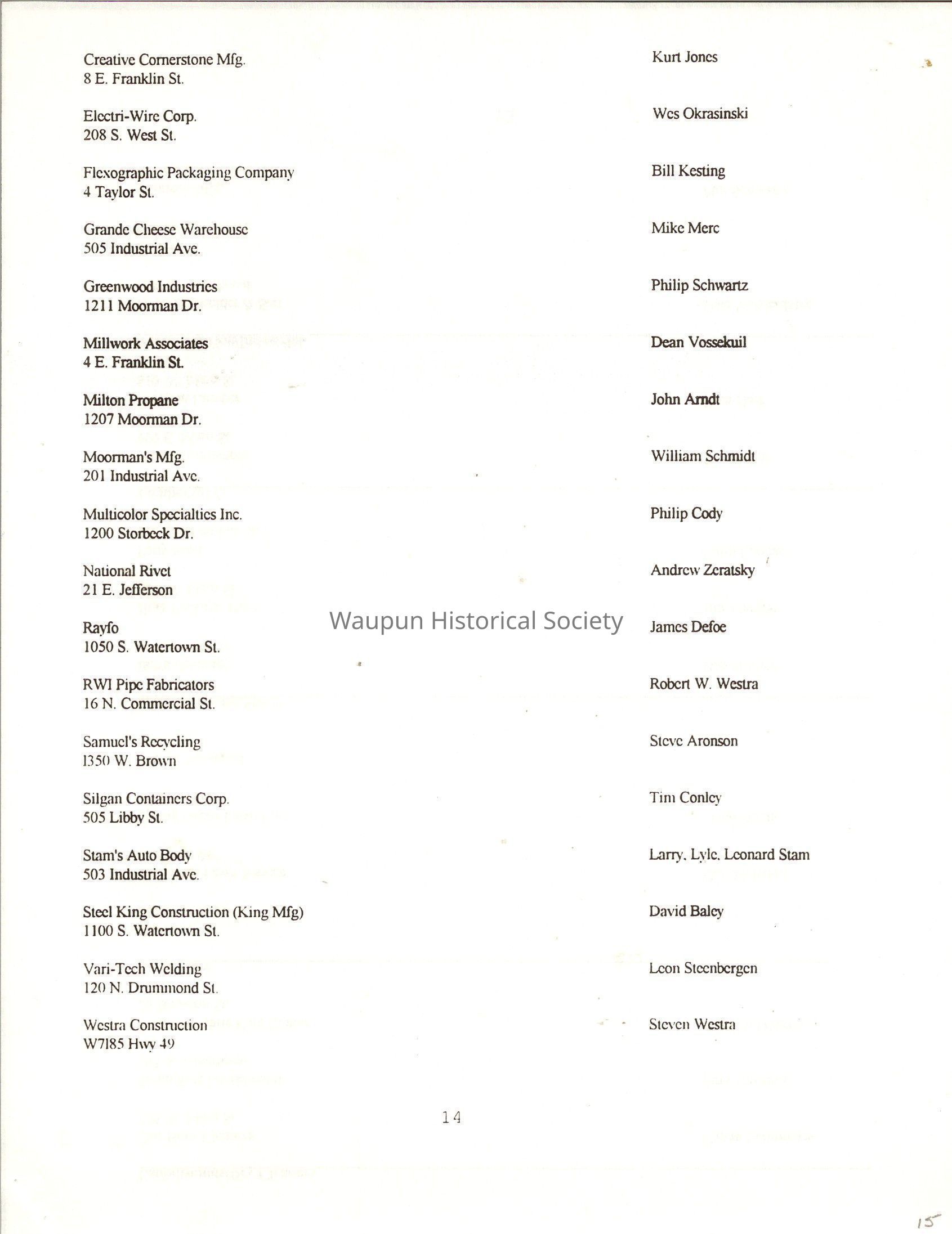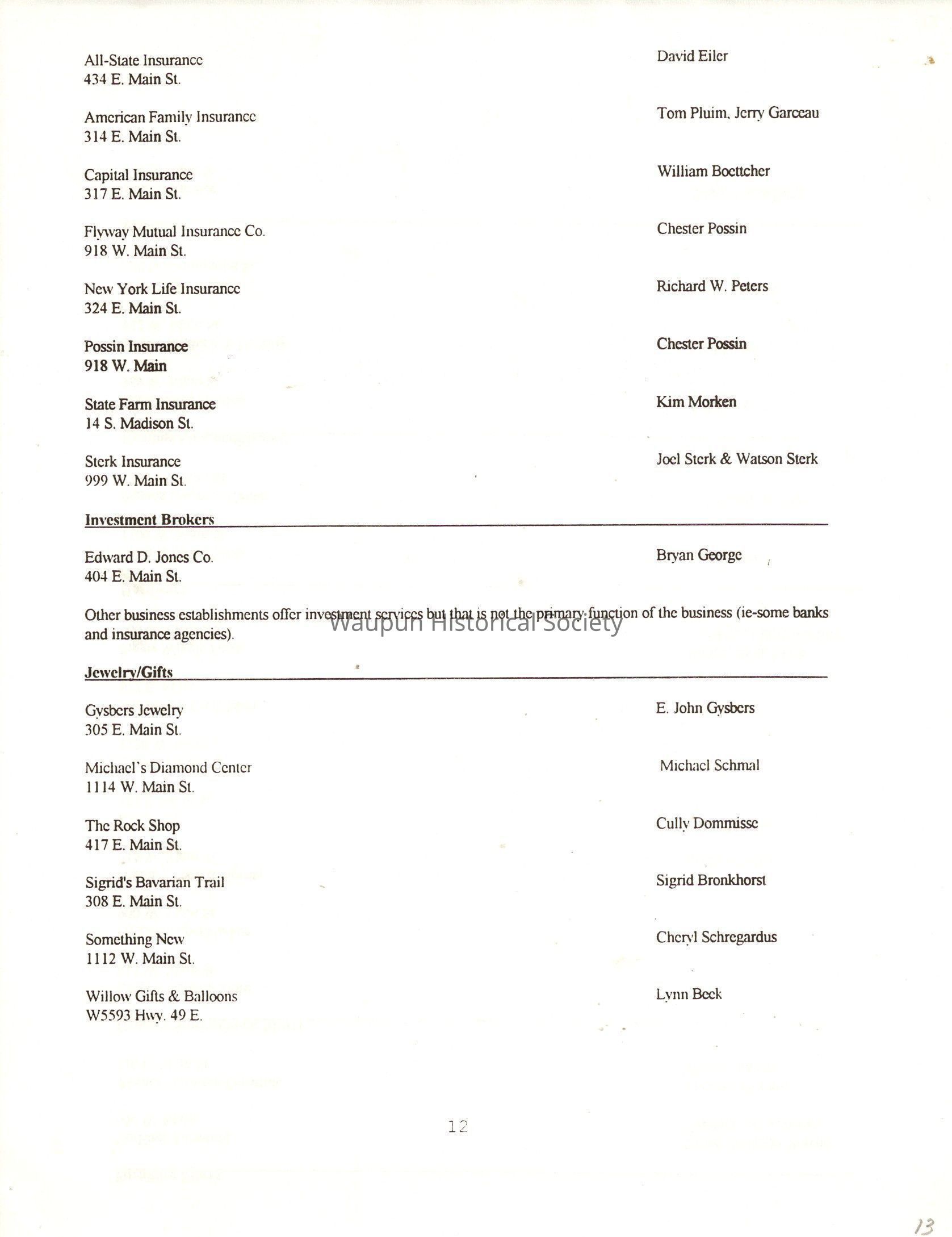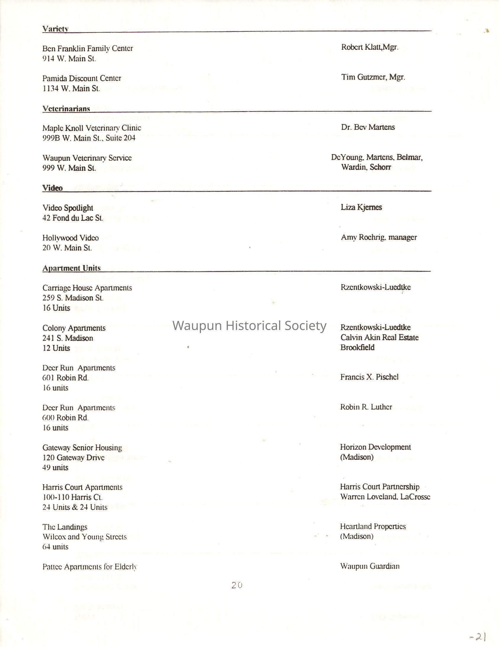 "City of Waupun Business Book" listing all businesses, addresses and owners/managers. Listed in alphabetical order by business type, shows the page number of it's listing within the book. Apartment units and mobile home parks, Vacant business buildings/land, group homes, hospital/medical,churches, the Waupun school system, parochial and pre-school/nursery and licensed day care, City of Waupun and Government offices and utilities and many miscellanious out of city limits businesses are included.
