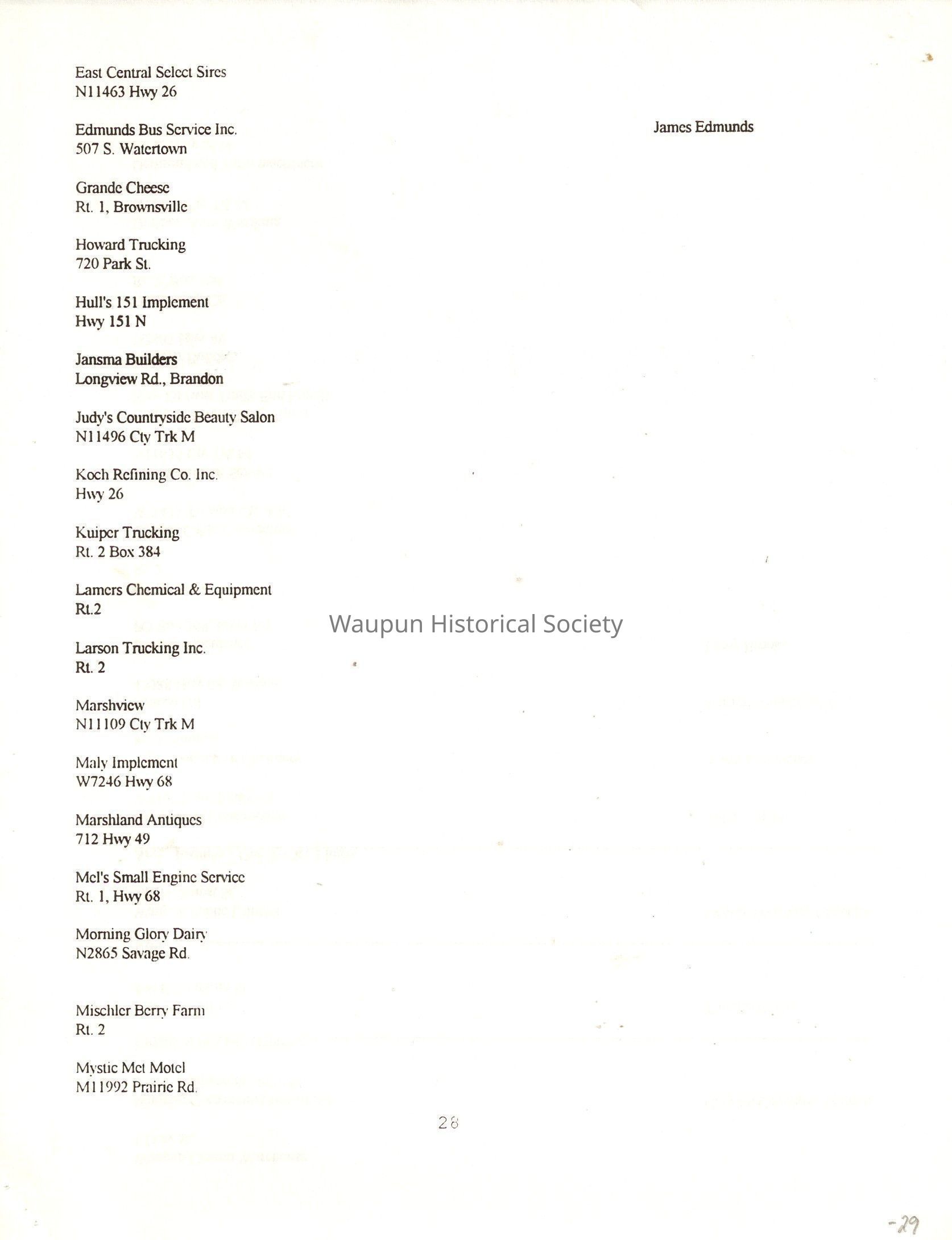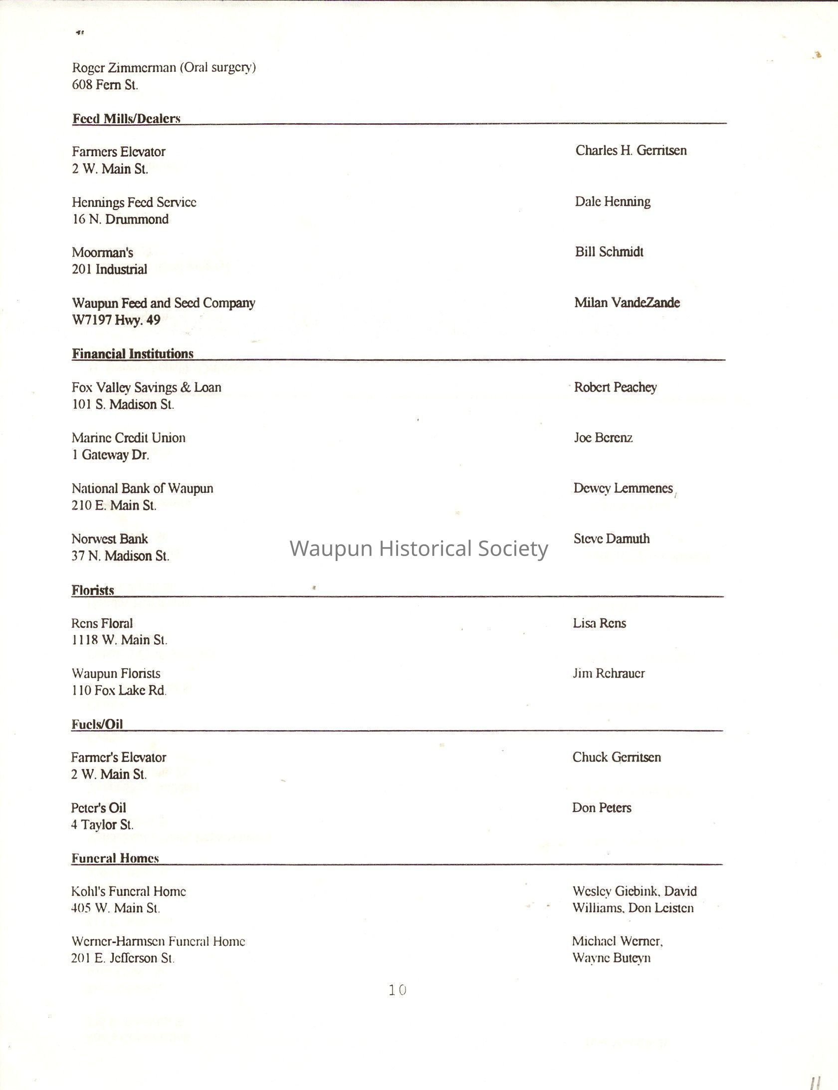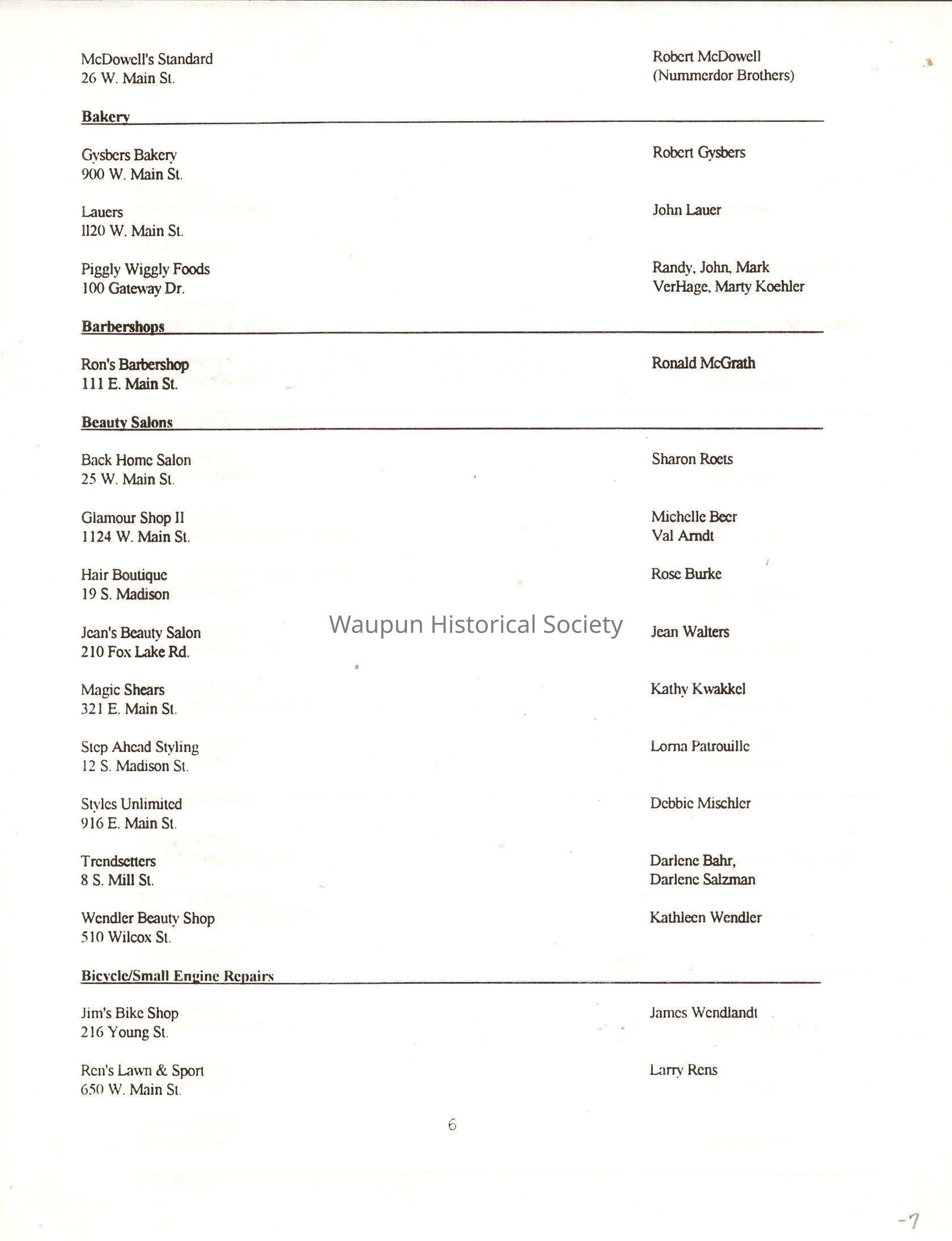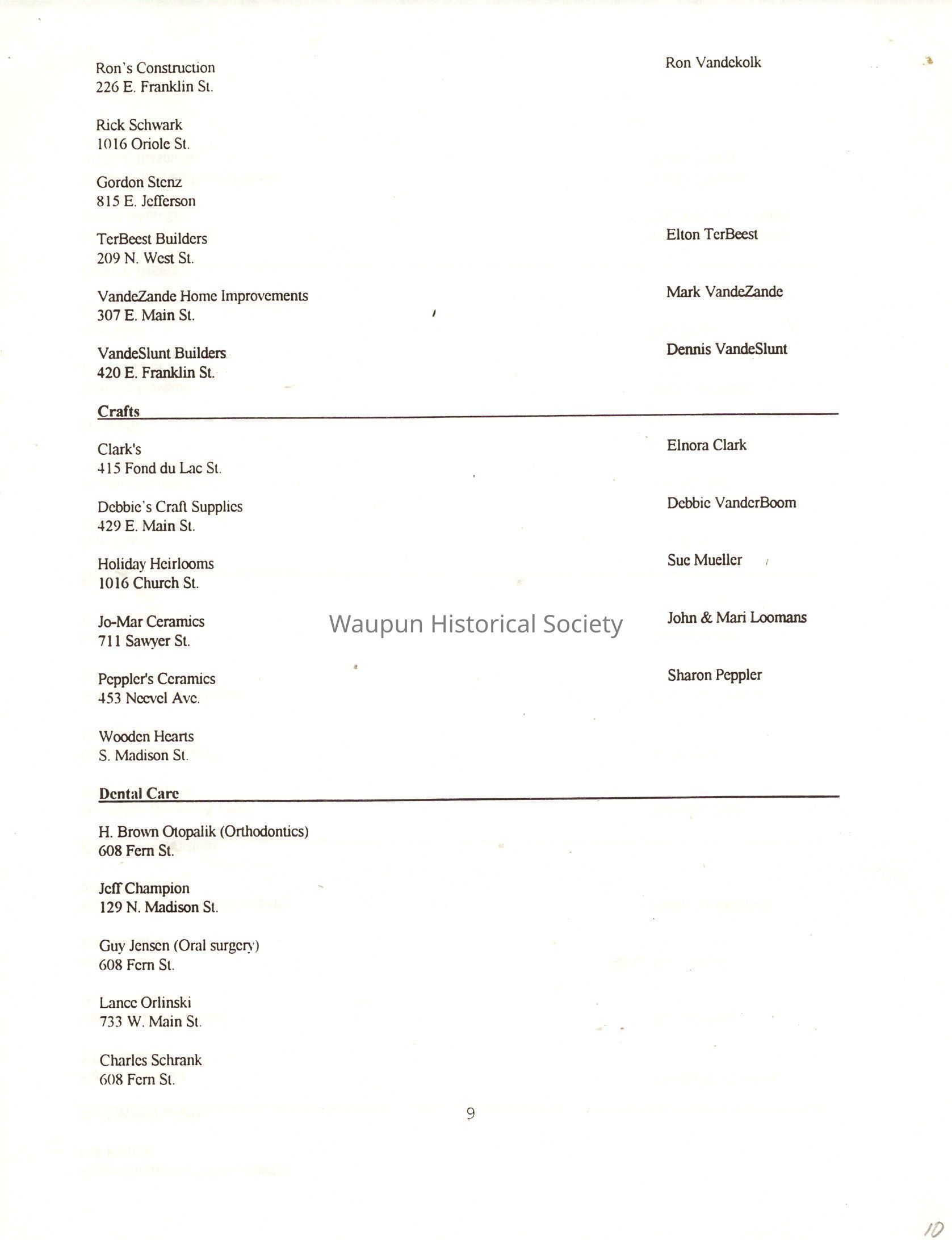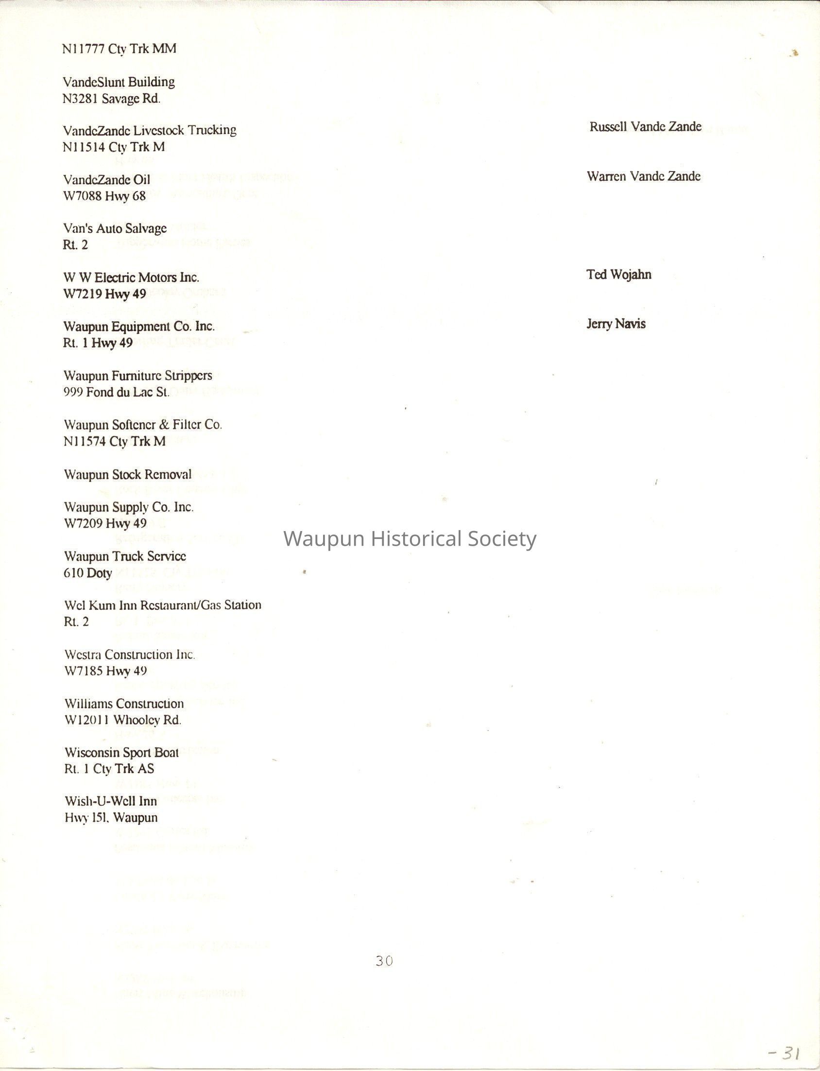 "City of Waupun Business Book" listing all businesses, addresses and owners/managers. Listed in alphabetical order by business type, shows the page number of it's listing within the book. Apartment units and mobile home parks, Vacant business buildings/land, group homes, hospital/medical,churches, the Waupun school system, parochial and pre-school/nursery and licensed day care, City of Waupun and Government offices and utilities and many miscellanious out of city limits businesses are included.