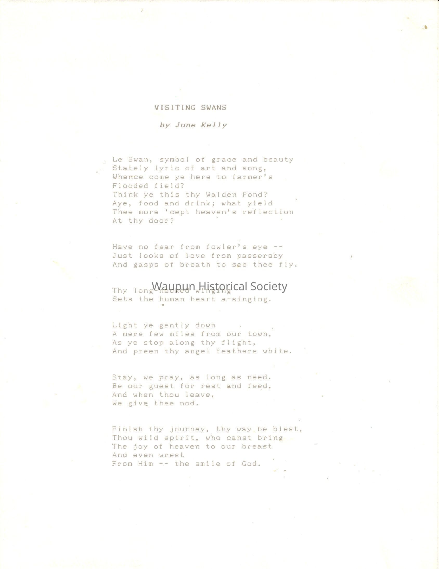 "Visiting Swans" poem written by June Kelly. Date unknown. Printed or typed on 8.5" X 11" standard white paper.VISITING SWANS