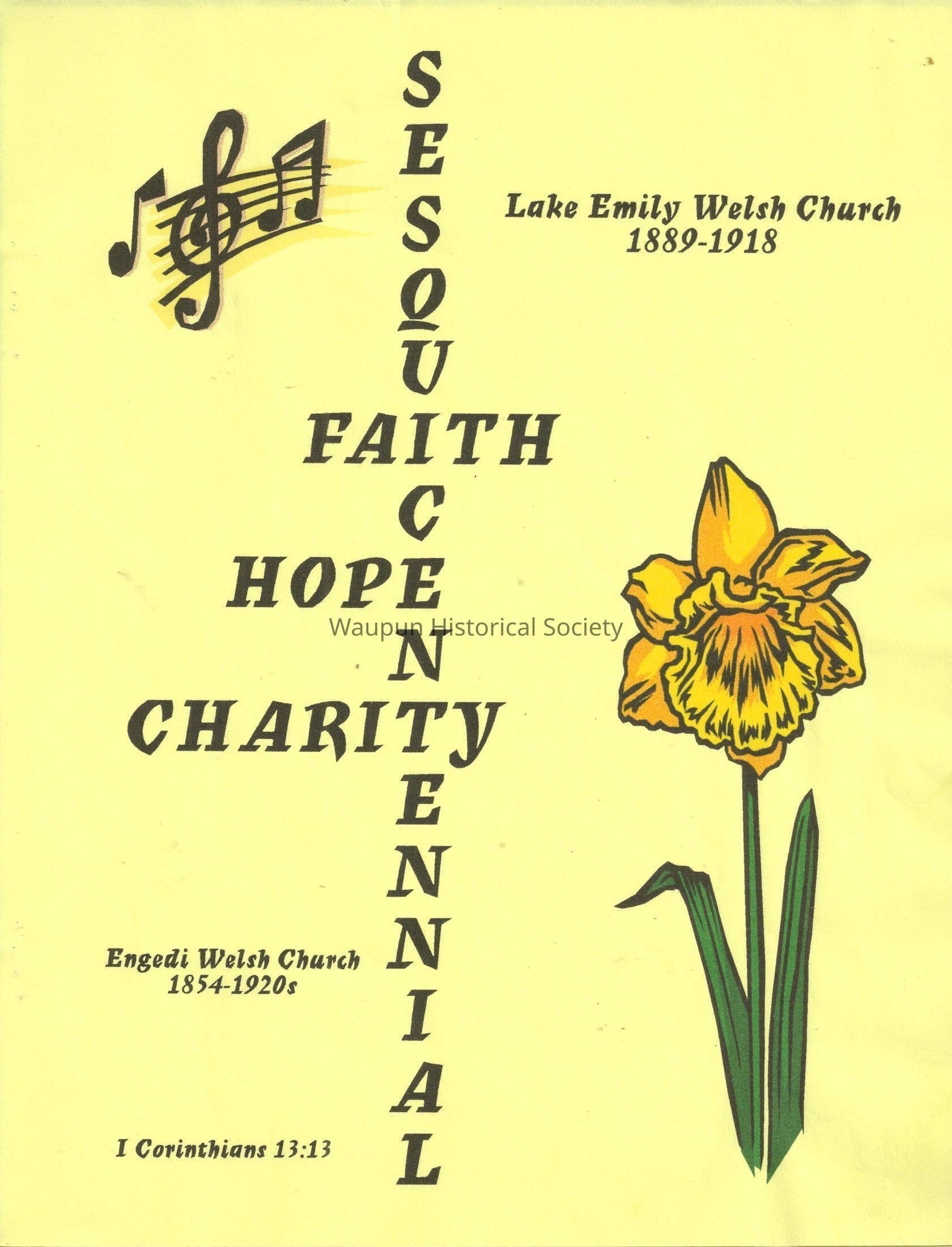 The booklet has a yellow paper top cover with a light plastic sheet to protect the document. The cover has the words FAITH, HOPE and CHARITY intertwined with the word SESQUICENNIAL. It is designed with a picture of musical notes, a daffodil , Lake Emily Welsh Church 1889 -1918 and Engedi Welsh Church 1854 - 1920s and 1 Corinthains 13:13. There are six pages of print, one page of photos of the Lake Emily Church at it's dedication in 1890 and what it had become 100 years later; Ken's T-V Shop in 1998.