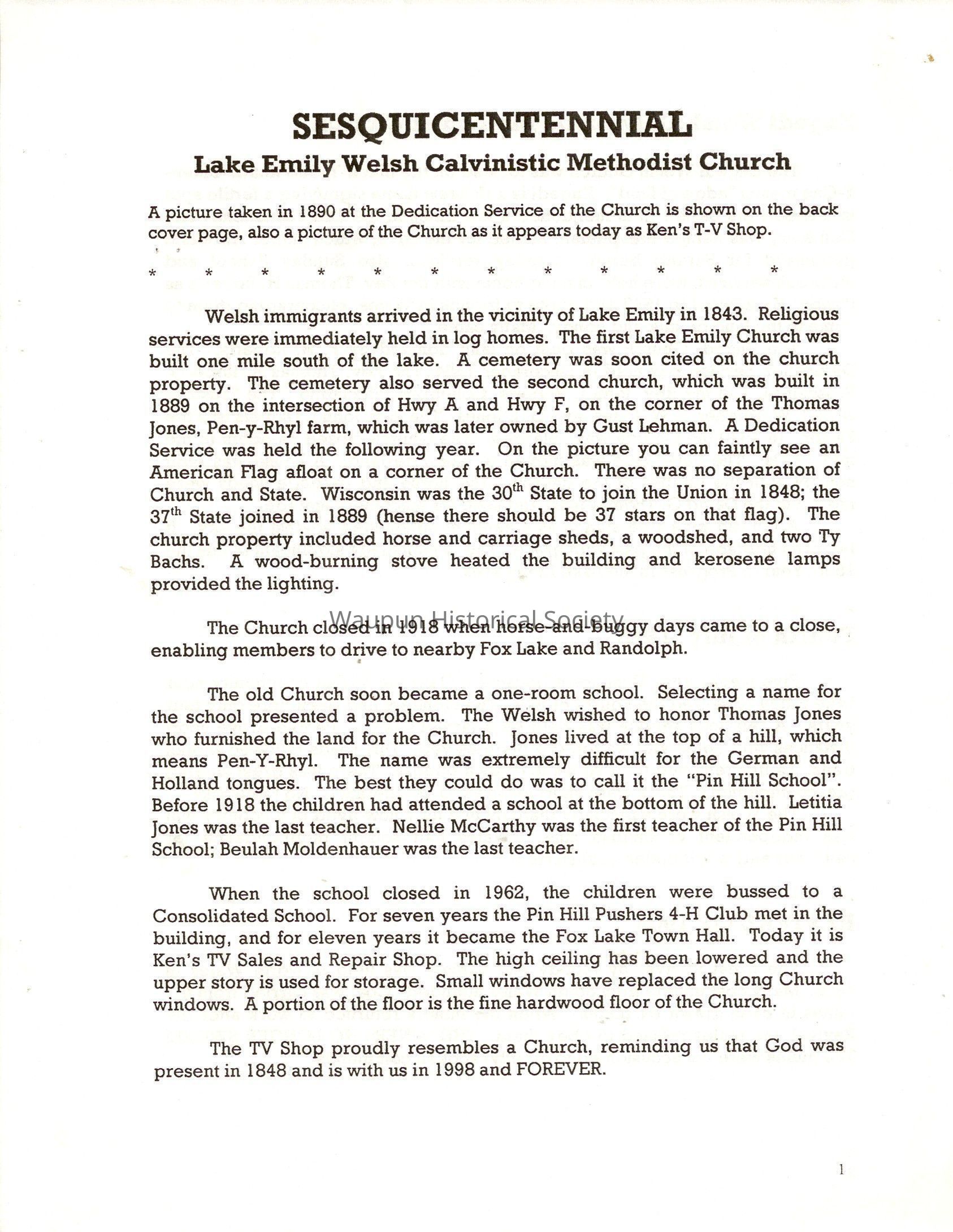 Booklet, Church, Sesquicentennial, Lake Emily Welsh Calvinistic Methodist Church. Sesquicentennial booklet prepared for the Lake Emily Welch Church and Engdi Welch Church. The booklet contains brief histories of the church, the people and the four lakes that make up the area.