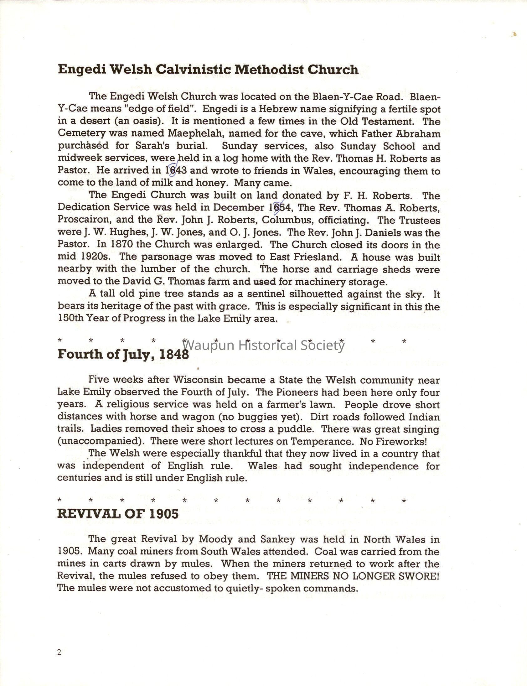 Five weeks after Wisconsin became a State the Welsh community near Lake Emily observed the Fourth of July. The Pioneers had been here only four years. A religious service was held on a farmer's lawn. People drove short distances with horse and wagon (no buggies yet). Dirt roads followed Indian trails. Ladies removed their shoes to cross a puddle. There was great singing (unaccompanied). There were short lectures on Temperance. No Fireworks!