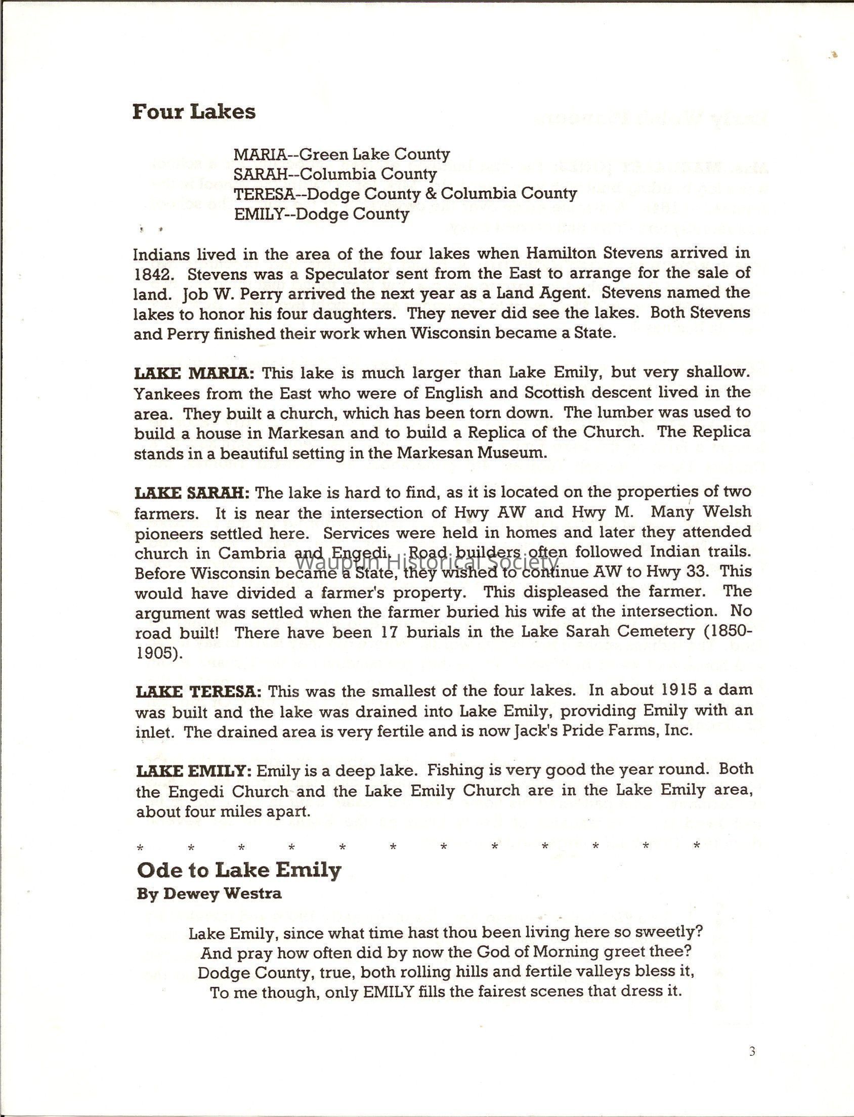 LAKE SARAH: The lake is hard to find, as it is located on the properties of two farmers. It is near the intersection of Hwy AW and Hwy M. Many Welsh pioneers settled here. Services were held in homes and later they attended church in Cambria and Engedi. Road builders often followed Indian trails. Before Wisconsin became a State, they wished to continue AW to Hwy 33. This would have divided a farmer's property. This displeased the farmer. The argument was settled when the farmer buried his wife at the intersection. No road built! There have been 17 burials in the Lake Sarah Cemetery (1850 - 1905).