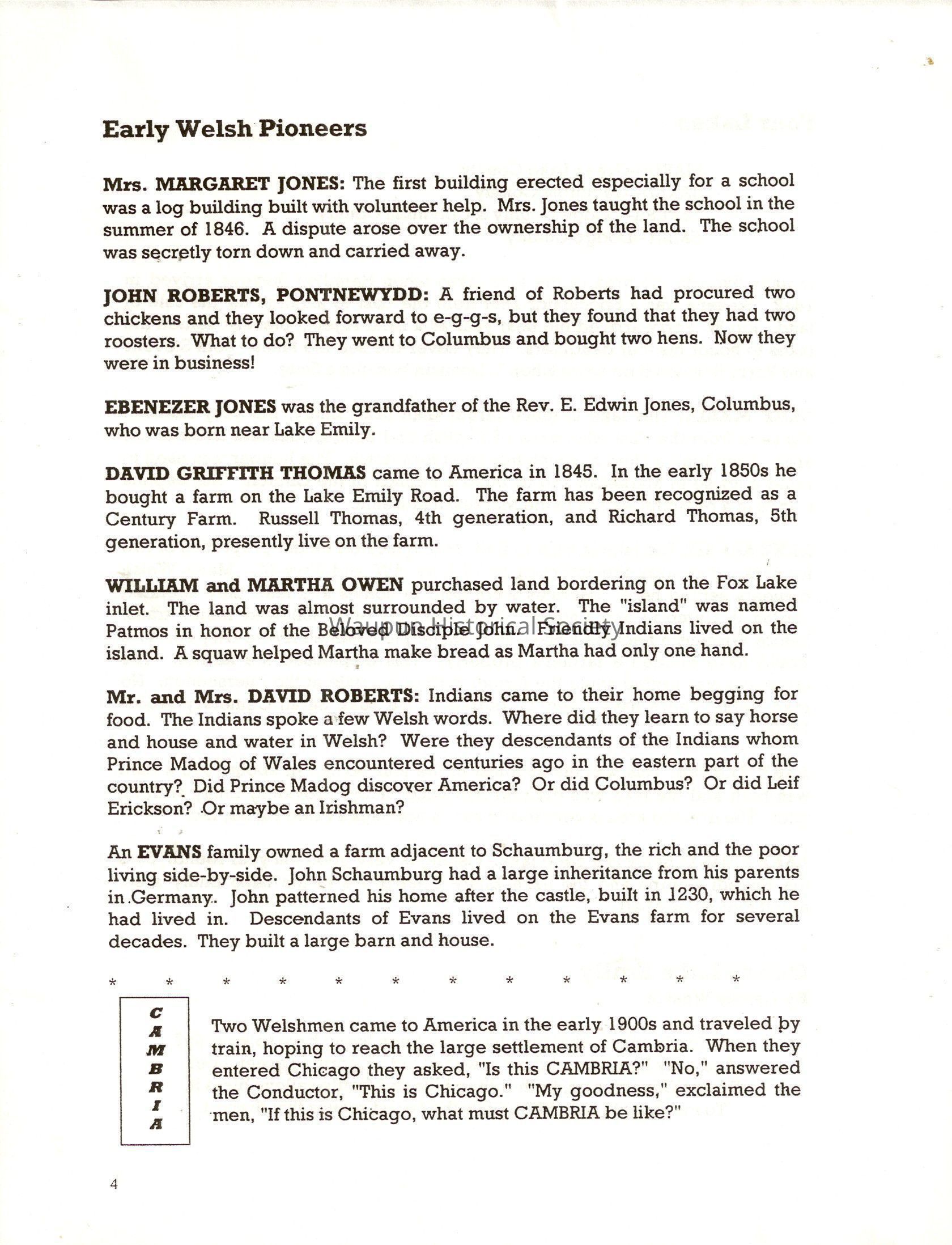 Two Welshmen came to America in the early 1900s and traveled ]Dy train, hoping to reach the large settlement of Cambria. When they entered Chicago they asked, "Is this CAMBRIA?" "No," answered the Conductor, "This is Chicago." "My goodness," exclaimed the men, "If this is Chicago, what must CAMBRIA be like?"
