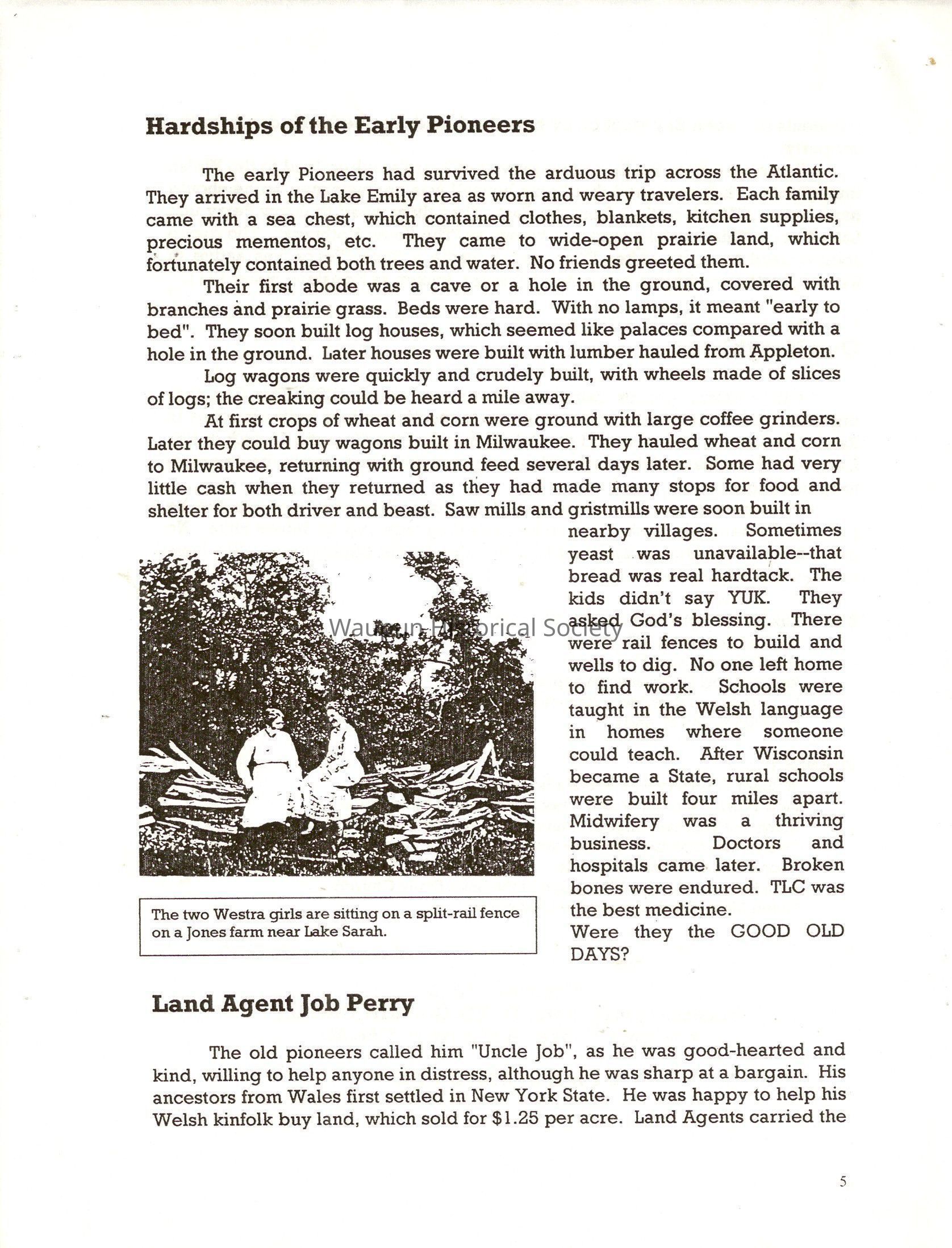 The old pioneers called him "Uncle Job", as he was good-hearted and kind, willing to help anyone in distress, although he was sharp at a bargain. His ancestors from Wales first settled in New York State. He was happy to help his Welsh kinfolk buy land, which sold for $1.25 per acre. Land Agents carried the payments to Green Bay afoot or by horseback and returned with deeds to the property.
