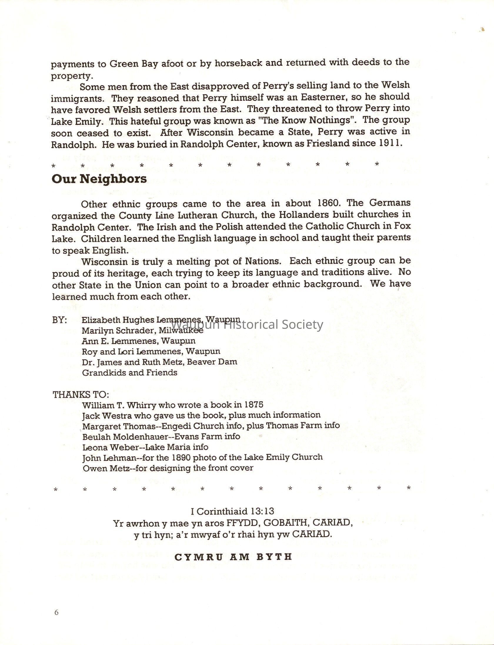 Some men from the East disapproved of Perry's selling land to the Welsh immigrants. They reasoned that Perry himself was an Easterner, so he should have favored Welsh settlers from the East. They threatened to throw Perry into Lake Emily. This hateful group was known as "The Know Nothings". The group soon ceased to exist. After Wisconsin became a State, Perry was active in Randolph. He was buried in Randolph Center, known as Friesland since 1911.