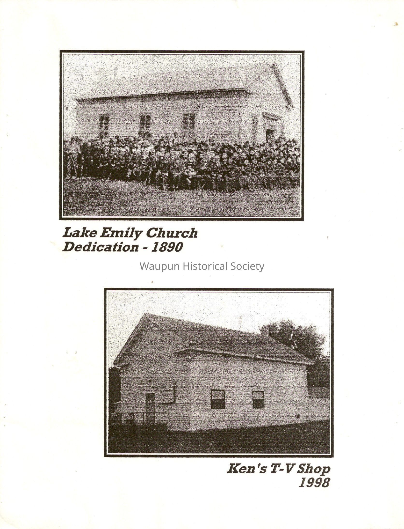 The back page shows a photo of the Lake Emily Church at its dedication in 1890 and a picture of what it had become in 1998, Ken's T-V Shop.Acquisition