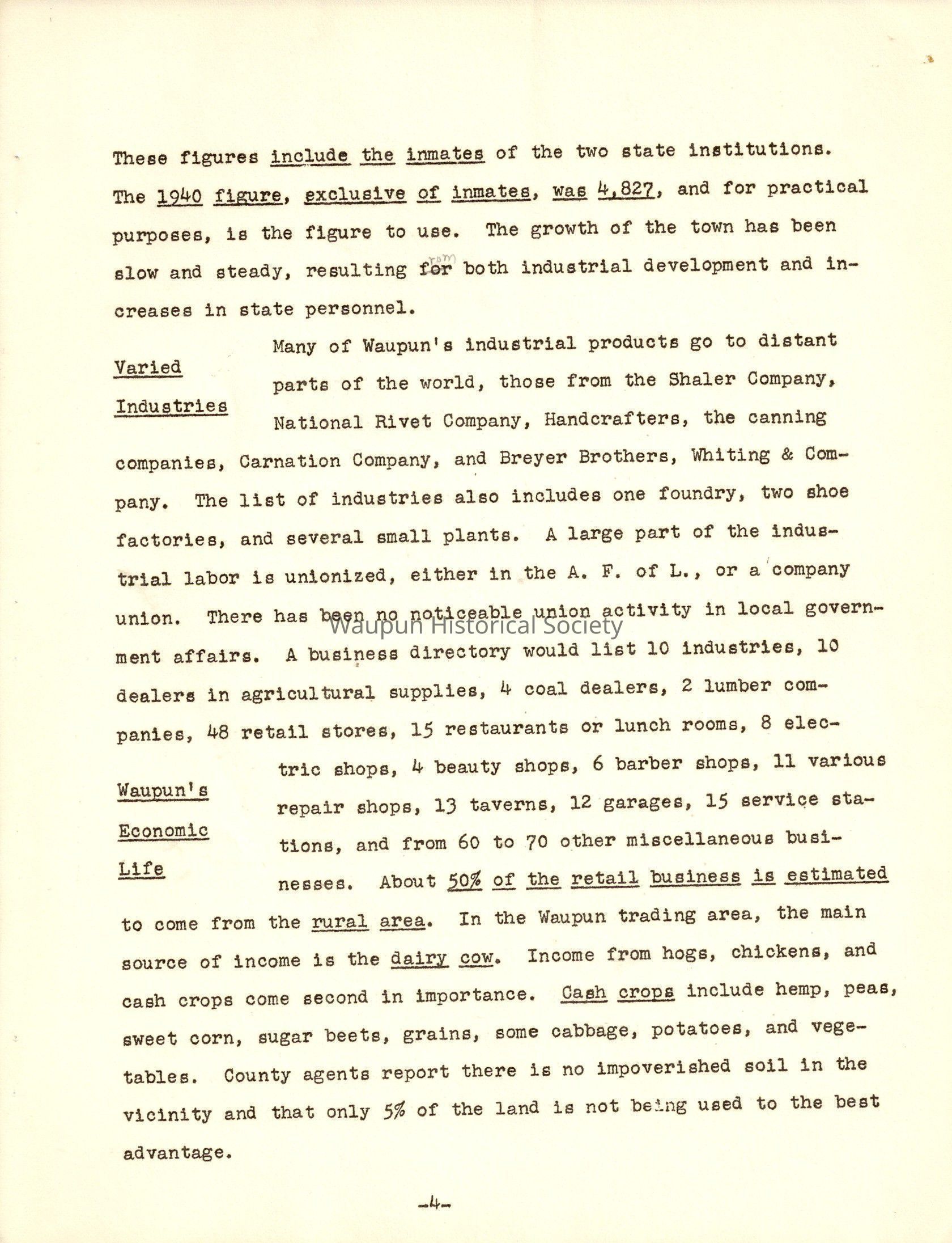 Many of Waupun's industrial products go to distant parts of the world, those from the Shaler Company, National Rivet Company, Handcrafters, the canning companies, Carnation Company, and Breyer Brothers, Whiting & Company. The list of industries also includes one foundry, two shoe factories, and several small plants. A large part of the industrial labor is unionized, either in the A. F. of L., or a company union. There has been no noticeable union activity in local government affairs. A business directory would list 10 industries, 10 dealers in agricultural supplies, 4 coal dealers, 2 lumber companies, 48 retail stores, 15 restaurants or lunch rooms, 8 electric shops, 4 beauty shops, 6 barber shops, 11 various Waupun is repair shops, 13 taverns, 12 garages, 15 service stations and from 60 to 70 other miscellaneous businesses. About 50% of the retail business is estimated to come from the rural area.