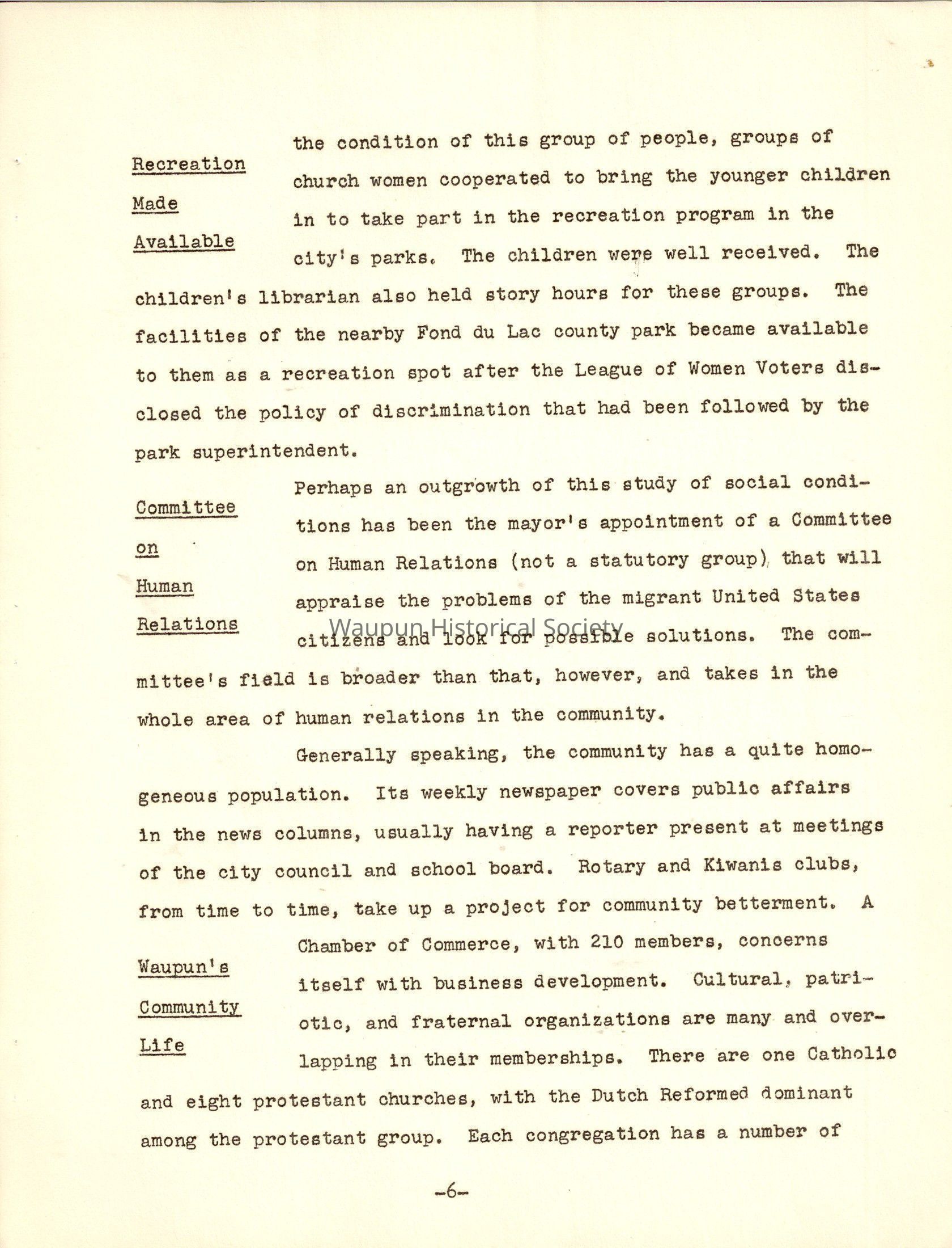 When the league's study brought more attention to the condition of this group of people, groups of church women cooperated to bring the younger children in to take part in the recreation program in the city's parks. The children were well received. The children's librarian also held story hours for these groups. The facilities of the nearby Fond du Lac county park became available to them as a recreation spot after the League of Women Voters disclosed the policy of discrimination that had been followed by the park superintendent.