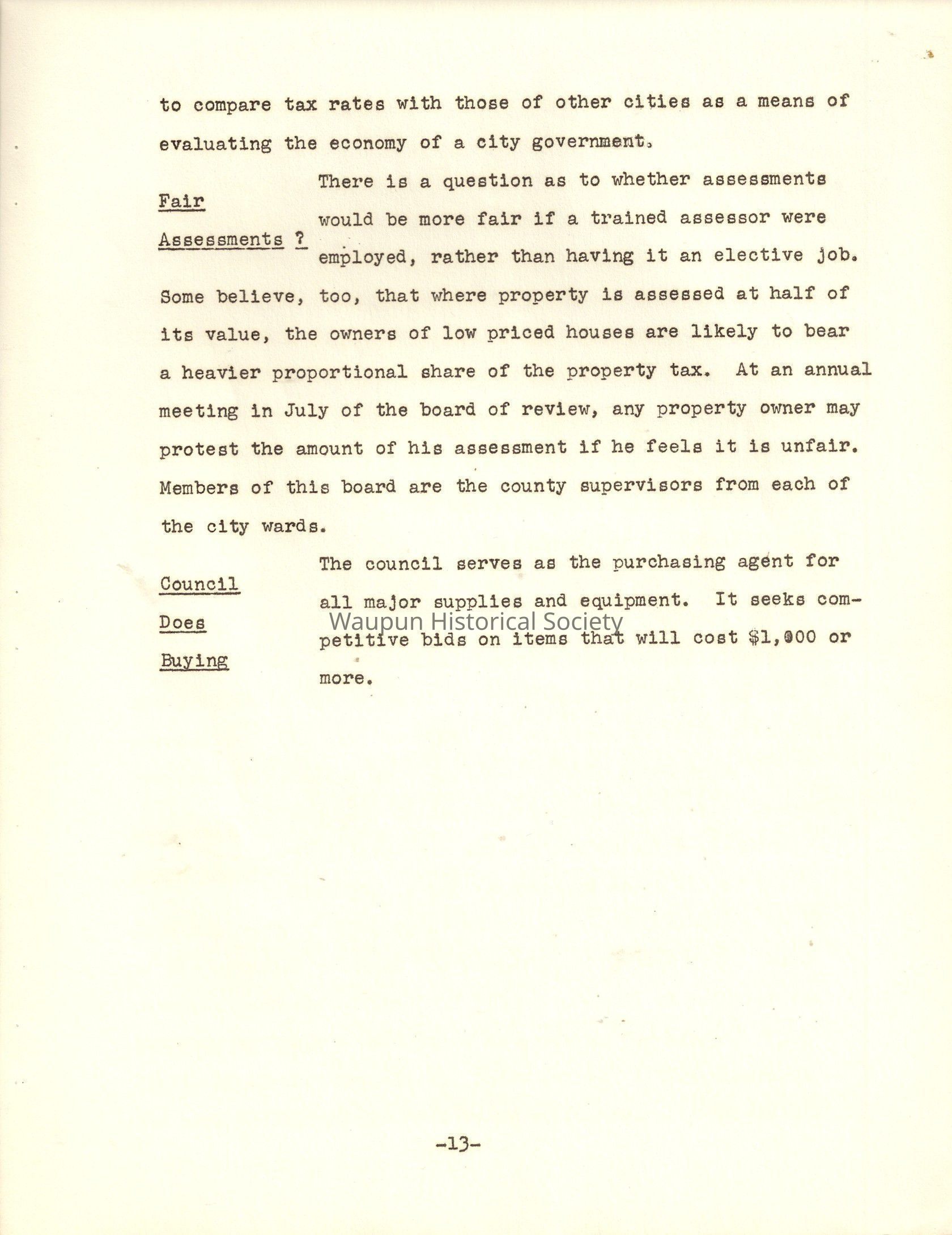 There is a question as to whether assessments would be more fair if a trained assessor were employed, rather than having it an elective job. Some believe, too, that where property is assessed at half of its value, the owners of low priced houses are likely to bear a heavier proportional share of the property tax. At an annual meeting in July of the board of review, any property owner may protest the amount of his assessment if he feels it is unfair. Members of this board are the county supervisors from each of the city wards.