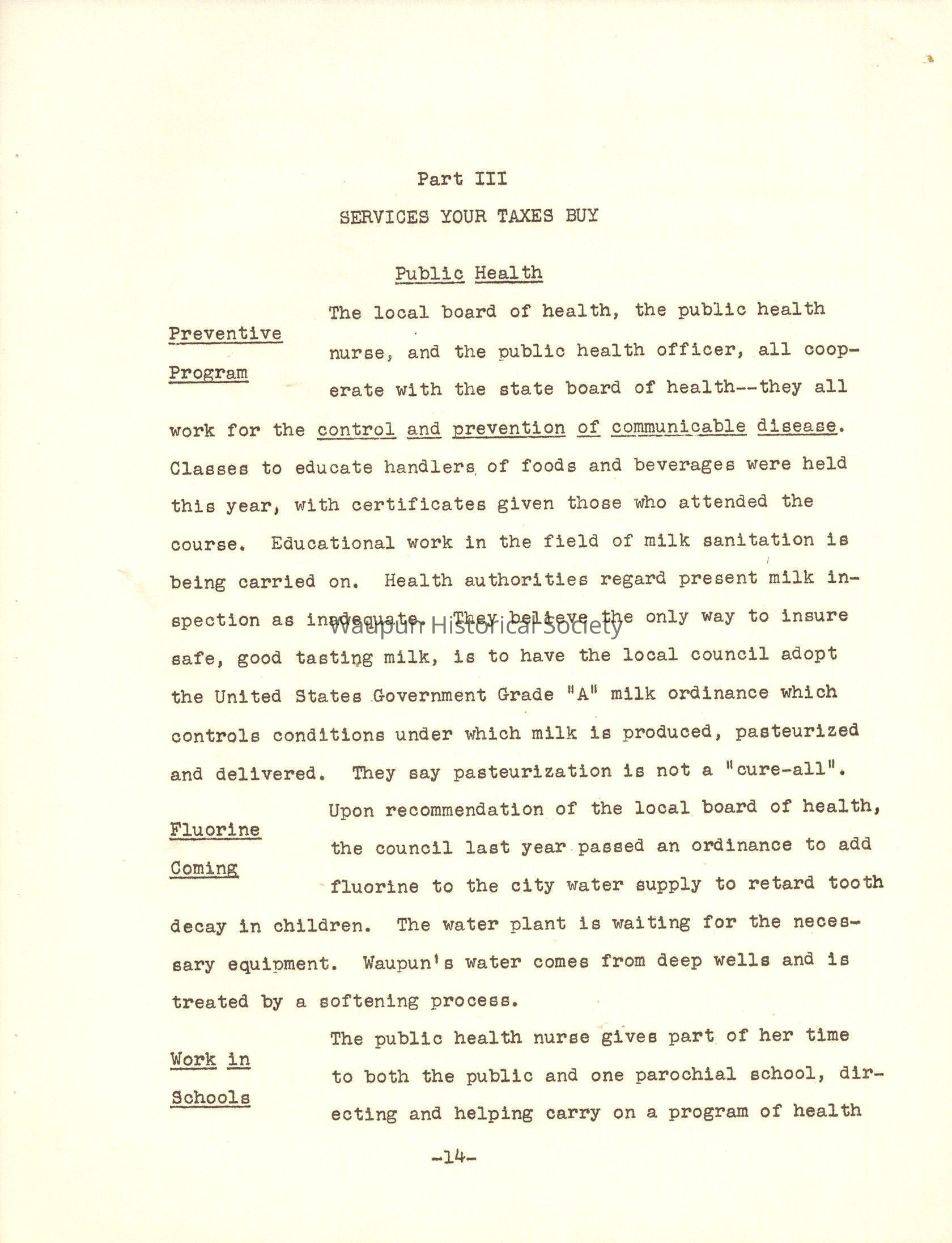 The local board of health, the public health nurse, and the public health officer, all cooperate with the state board of health--they all work for the control and prevention of communicable disease. Classes to educate handlers of foods and beverages were held this year, with certificates given those who attended the course. Educational work in the field of milk sanitation is being carried on. Health authorities regard present milk inspection as inadequate. They believe the only way to insure safe, good tasting milk, is to have the local council adopt the United States Government Grade "A" milk ordinance which controls conditions under which milk is produced, pasteurized and delivered. They say pasteurization is not a "cure-all".