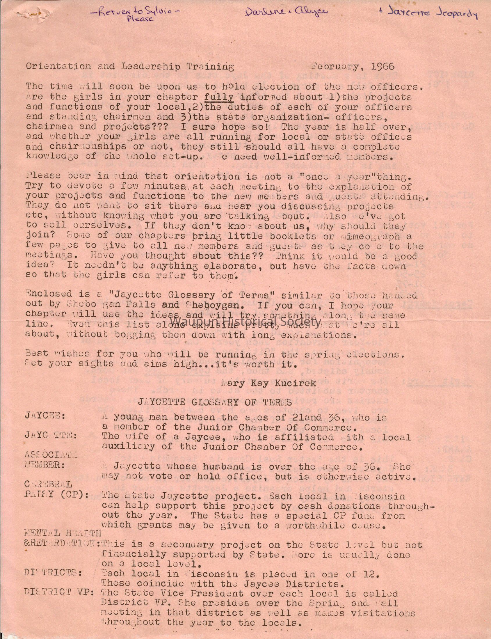 Enclosed is a "Jaycette Glossary of Terms" similar to those handed out by Sheboygan Falls and Sheboygan. If you can, I hope your chapter will use the ideas and will try something along the same line. Even this list alone explains pretty much what we're all about, without bogging them down with long explanations.