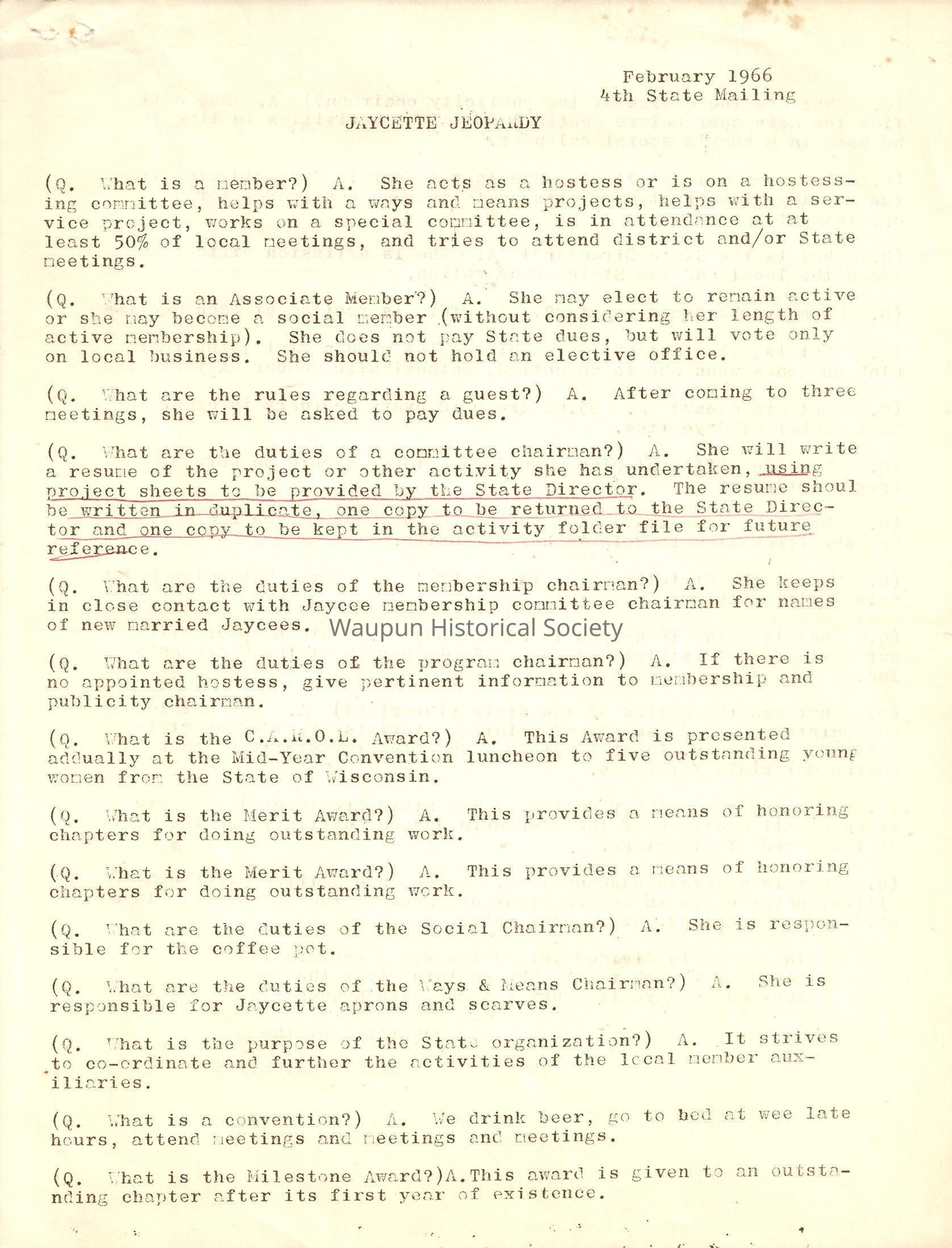 (Q. What are dues?) A. $5.00 are paid every February in order to be a member of Jaycettes.