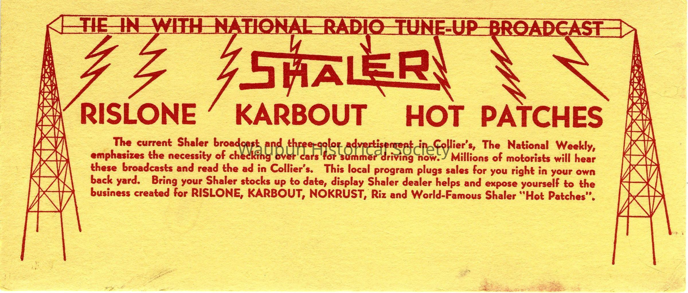 The current Shaler broadcast and three-color advertisement in Collier's, The National Weekly, emphasizes the necessity of checking over cars for summer driving now. Millions of motorists will hear these broadcasts and read the ad in Collier's. This local program plugs sales for you right in your own back yard. Bring your Shaler stocks up to date, display Shaler dealer helps and expose yourself to the business created for RISLONE, KARBOUT, NOKRUST, Riz and World-Famous Shafer "Hot Patches".Acquisition