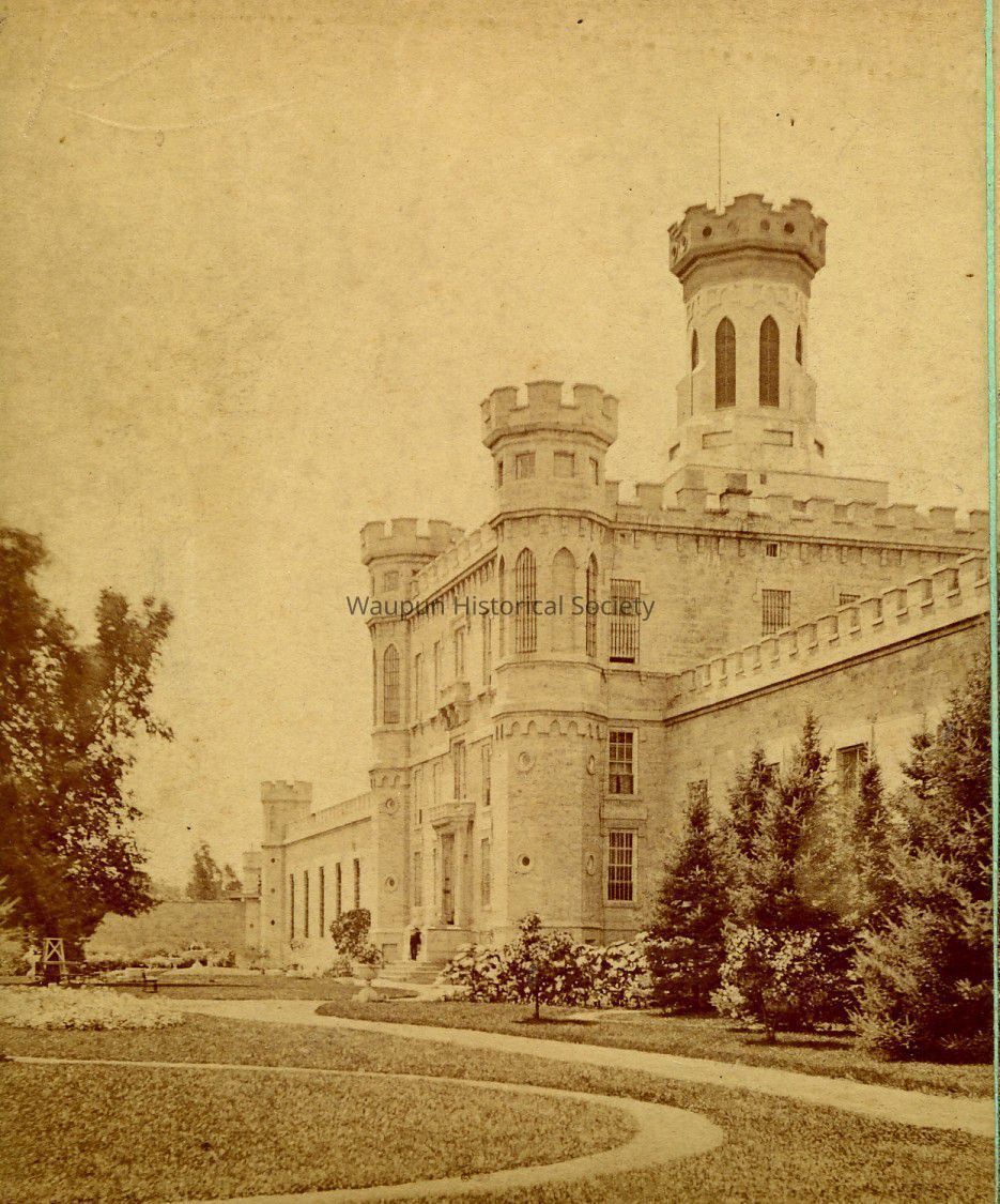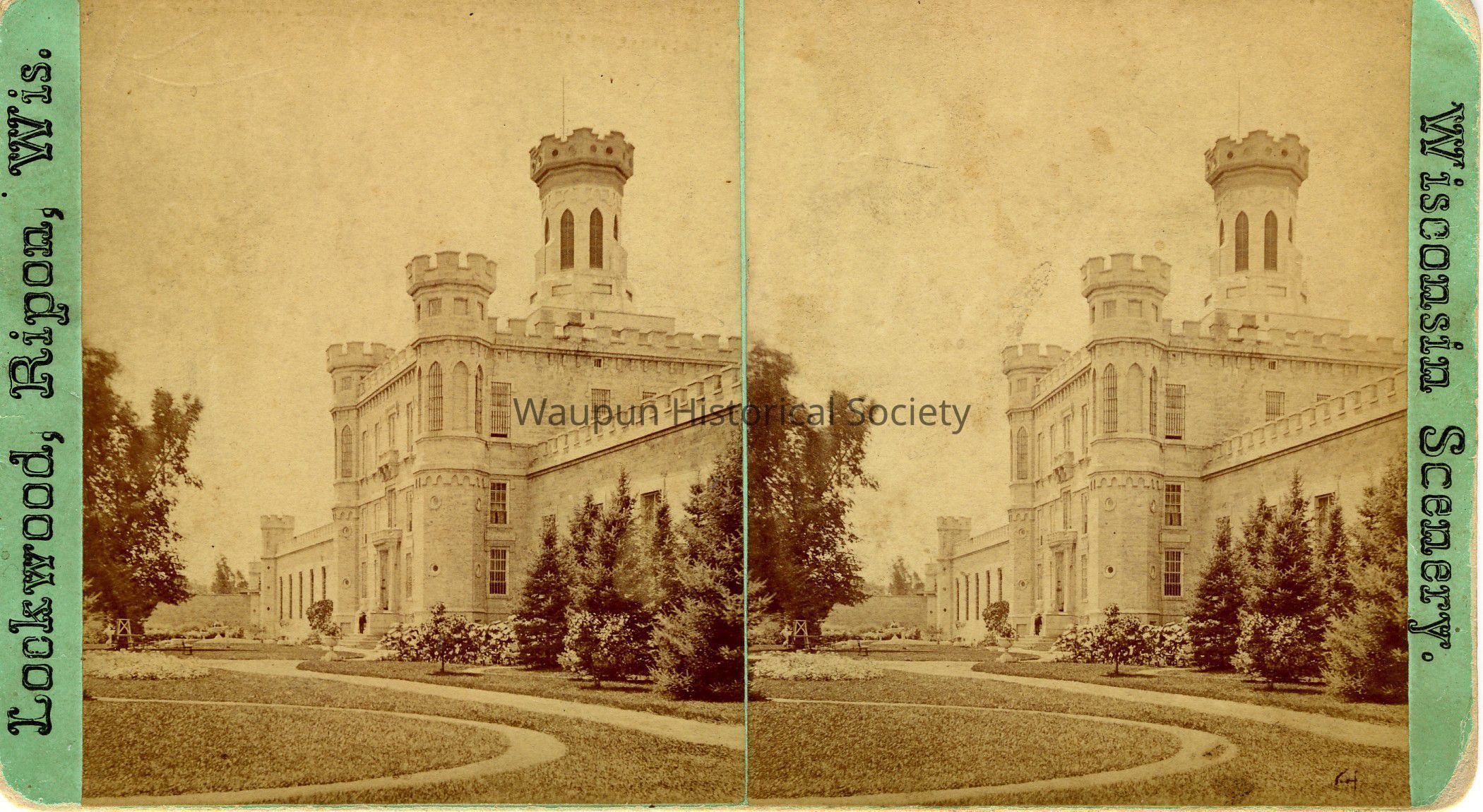 Stereo view of the front of the prison. The Stereo indicates Lockwood, Ripon, Wis. and Wisconsin Scenery. During this period of history the front area of the prison, between the building and the fence as landscaped. You can see the quality of the lawn, trees and plantings. This area in front of the prison has had a building added and you can no longer see most of it.Acquisition